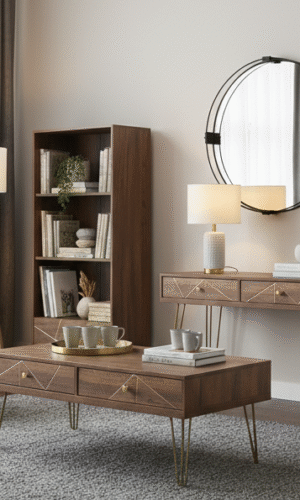 Elevate your hallway or living space with the Talia Console Table in warm wood tones. Features two drawers, metallic hairpin legs & mid-century style flair.