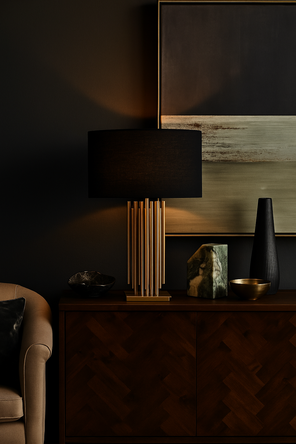 Add modern flair with the Avela Table Lamp in black or gold. Asymmetric iron pipes and a soft linen shade create ambient light with sculptural elegance.