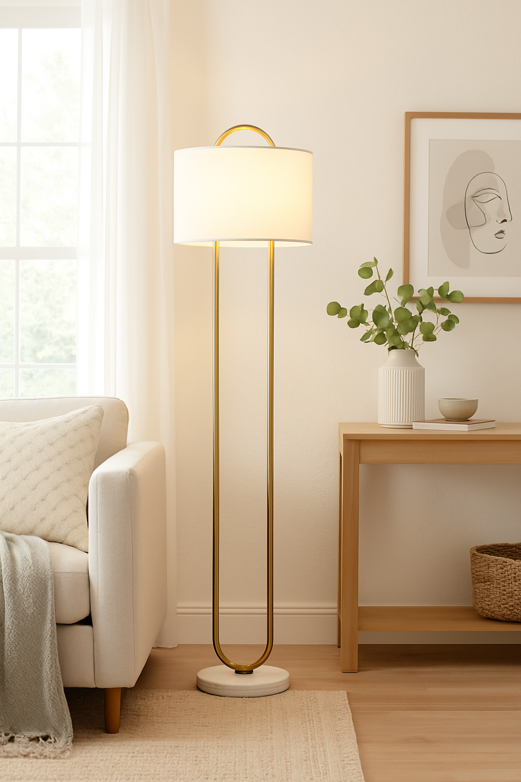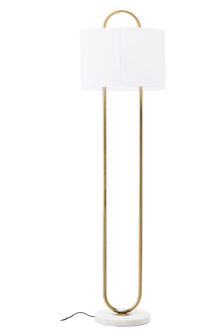 A white fabric shade sits neatly at the top, diffusing light softly to create a warm, inviting glow. The gentle illumination makes this floor lamp ideal for living rooms, bedrooms, or reading corners where comfort and sophistication meet.