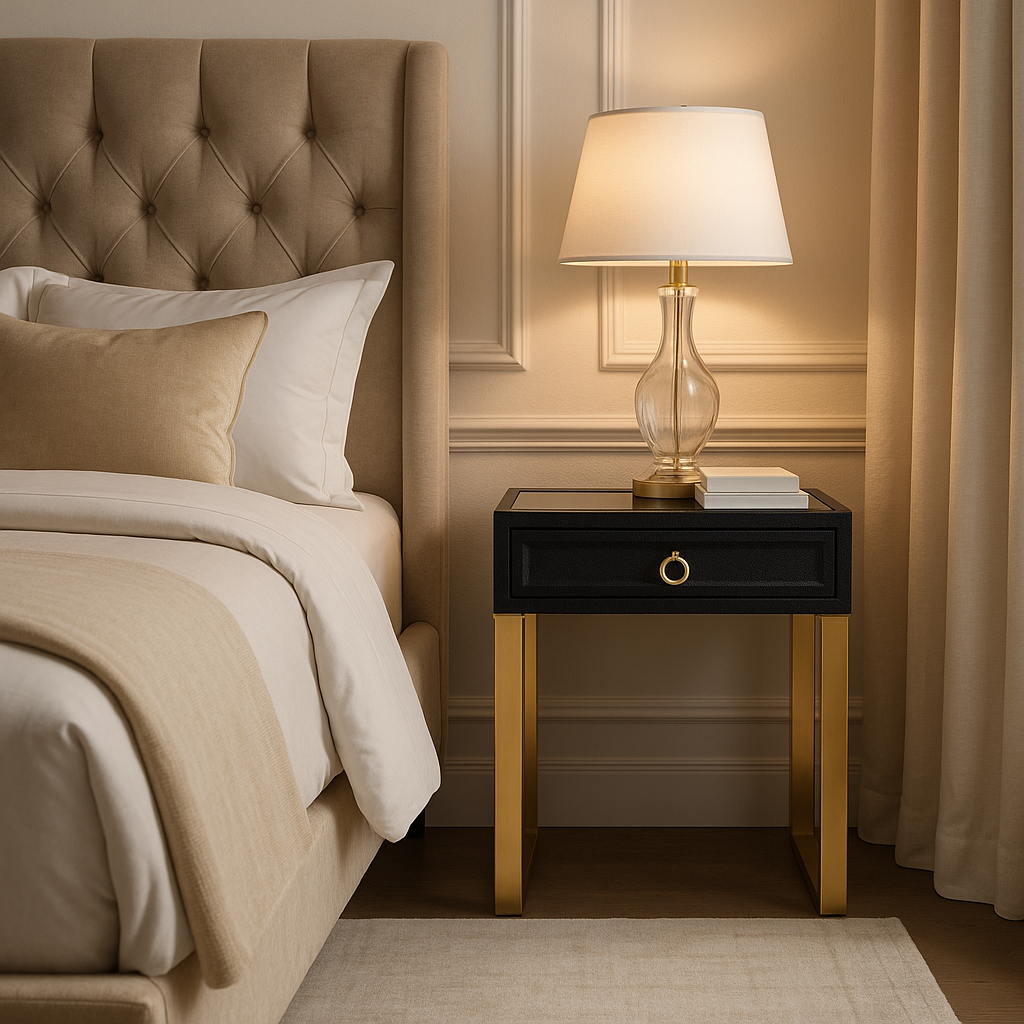 The Cardoba Bedside Table suits both modern and boutique interiors. Its dark, luxurious tones and gold details pair beautifully with neutral linens, marble accents, or warm lighting. Whether used beside your bed or as an elegant side table in a lounge, it enhances your home with understated sophistication.