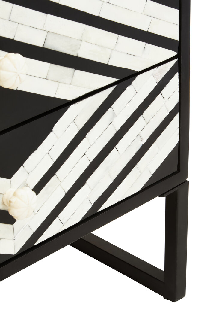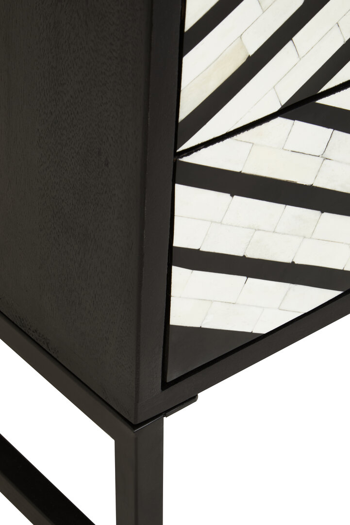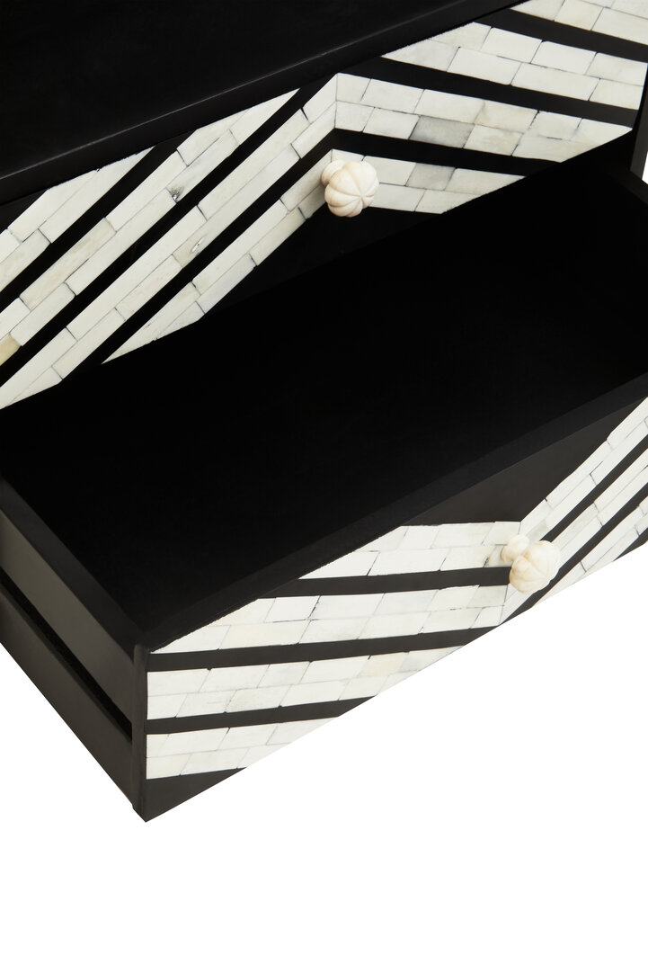 The Casia Bedside Table features white bone inlay, floral grips & sleek black wood. A handcrafted piece that blends exotic artistry with modern luxury.
