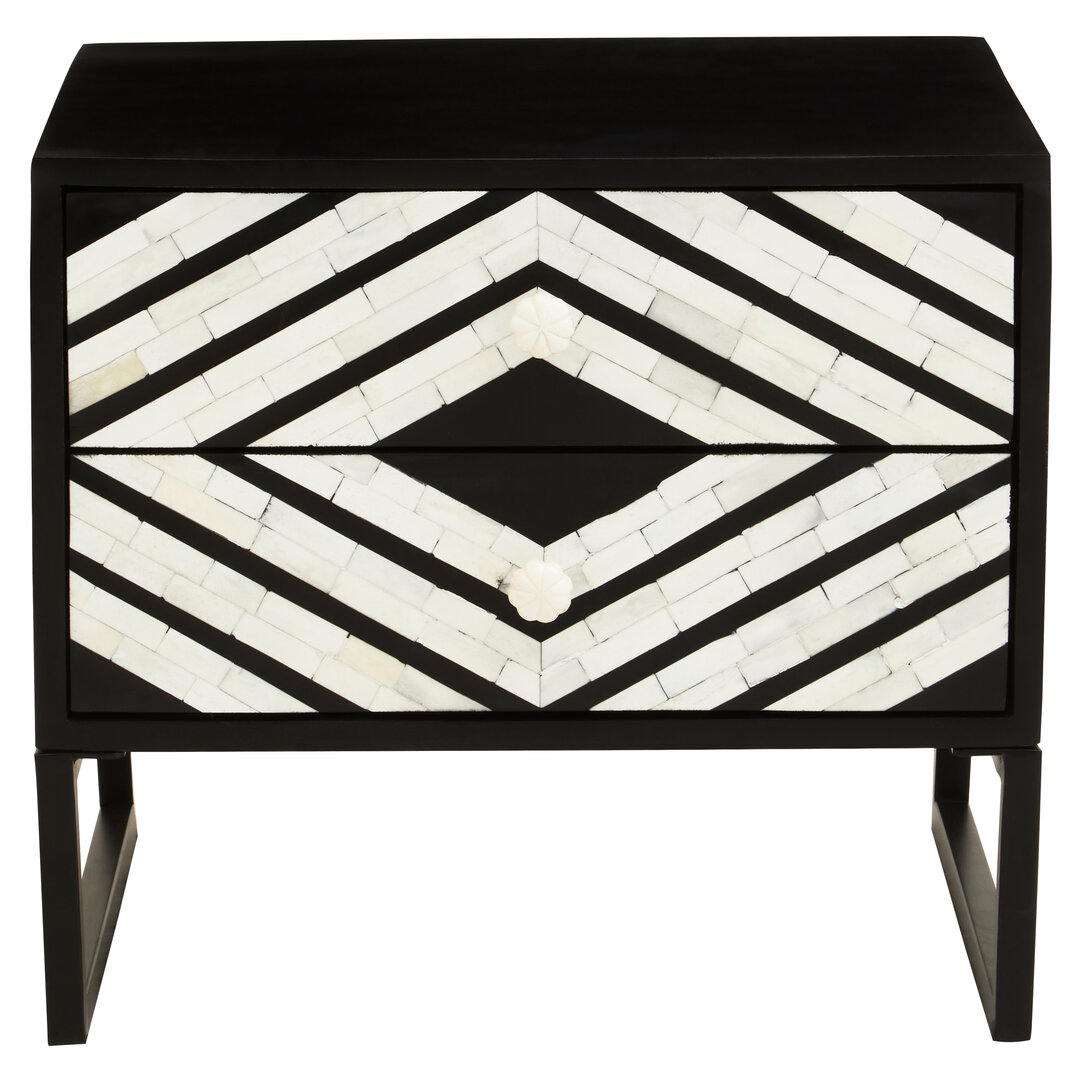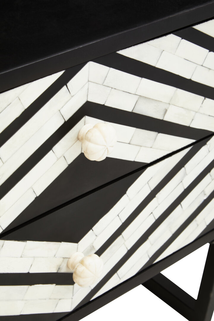 The Casia Bedside Table combines artisanal craftsmanship with contemporary style, creating a truly eye-catching piece. Designed to make a dramatic focal point, it features hand-laid white bone inlay forming an intricate, exotic pattern across its surface. The delicate detailing contrasts beautifully with the solid black wood, giving the table both visual depth and timeless appeal.