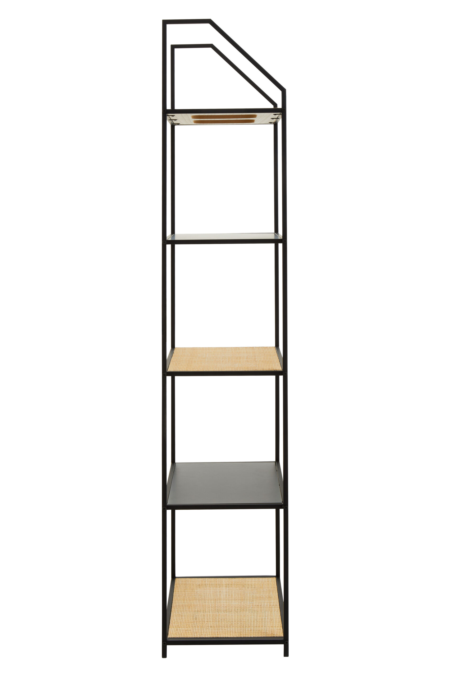 Dakota 5 Tier Shelf Unit features black metal and natural rattan shelves. Stylish, sturdy storage for books and decor. Perfect for any space.