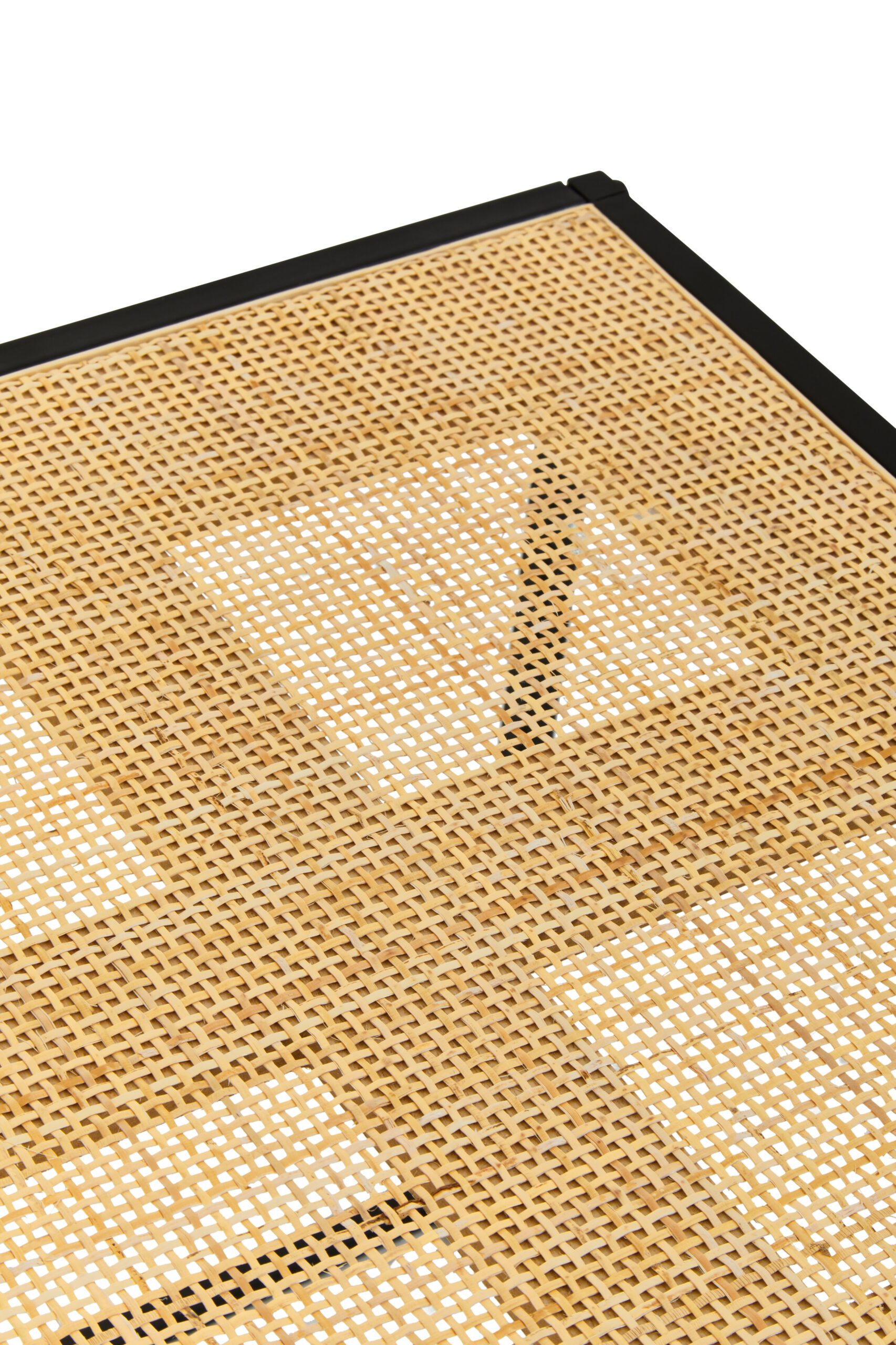 Supporting the top is a strong black metal frame in a clean square shape. Its slim profile and crisscross base create a minimalist look, ensuring stability while maintaining a sleek design. The black finish provides a bold contrast to the light rattan top, enhancing the table’s overall visual impact.