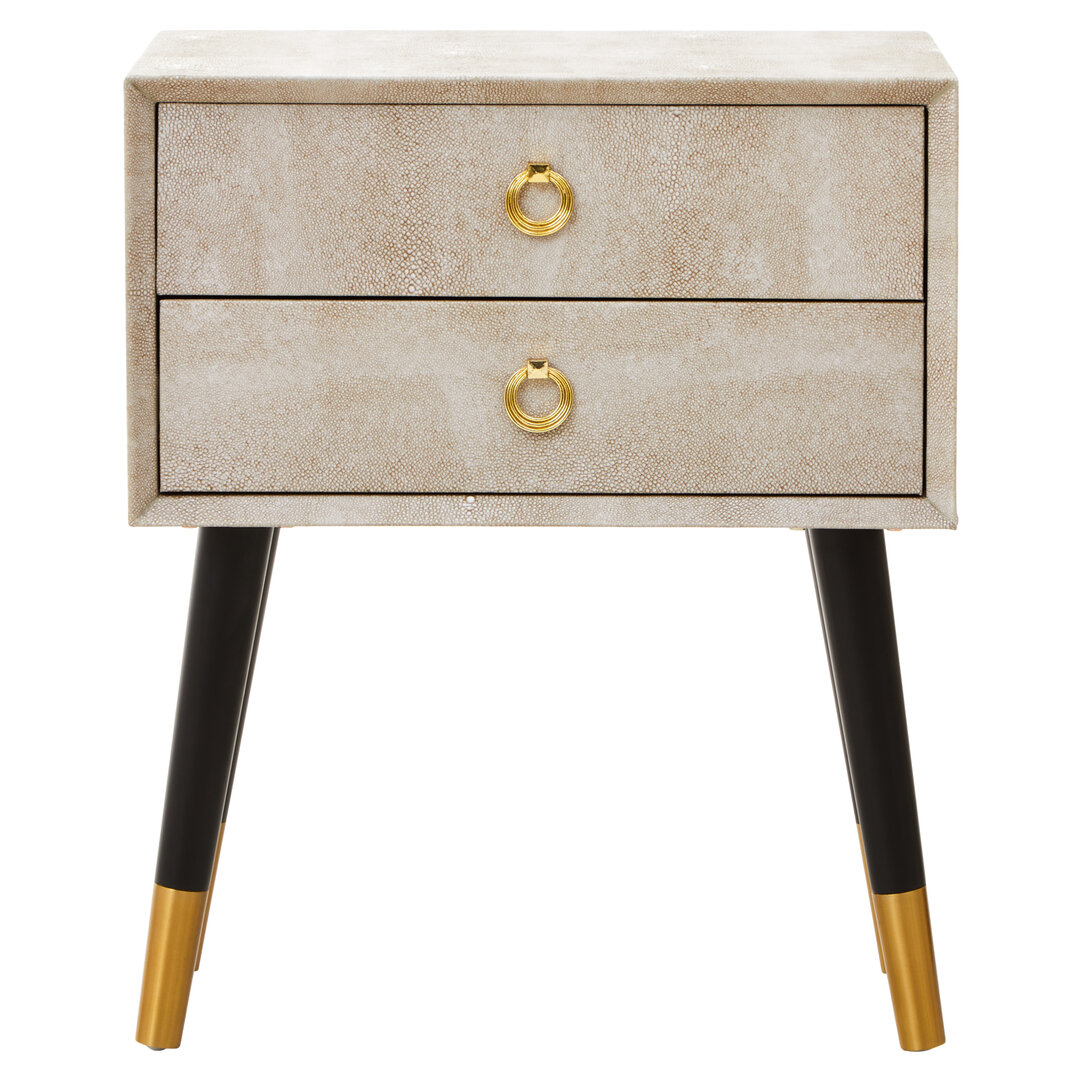 The Fiora Shagreen Bedside Table features shagreen leather, gold accents & black legs. A luxurious 2 drawer bedside table that blends elegance & design