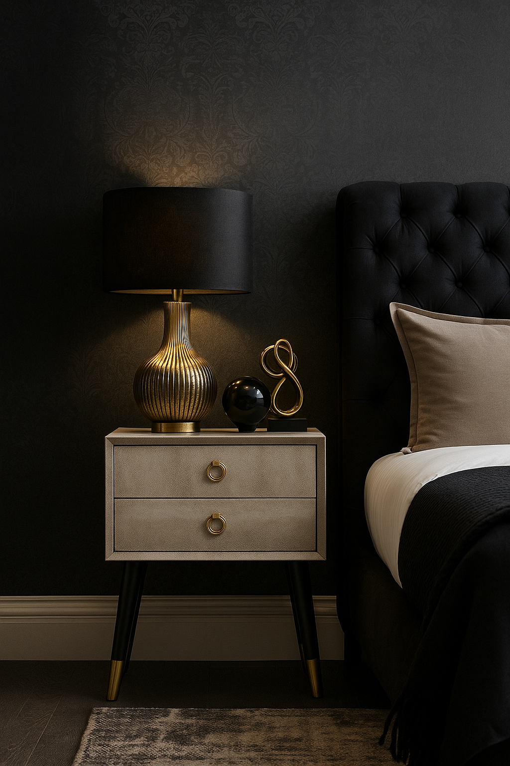 Perfect for modern, art deco, or boutique-inspired interiors, the Fiora Shagreen Bedside Table pairs functionality with luxury. Its textured finish, black frame, and gold detailing make it a standout addition to both contemporary and classic spaces.