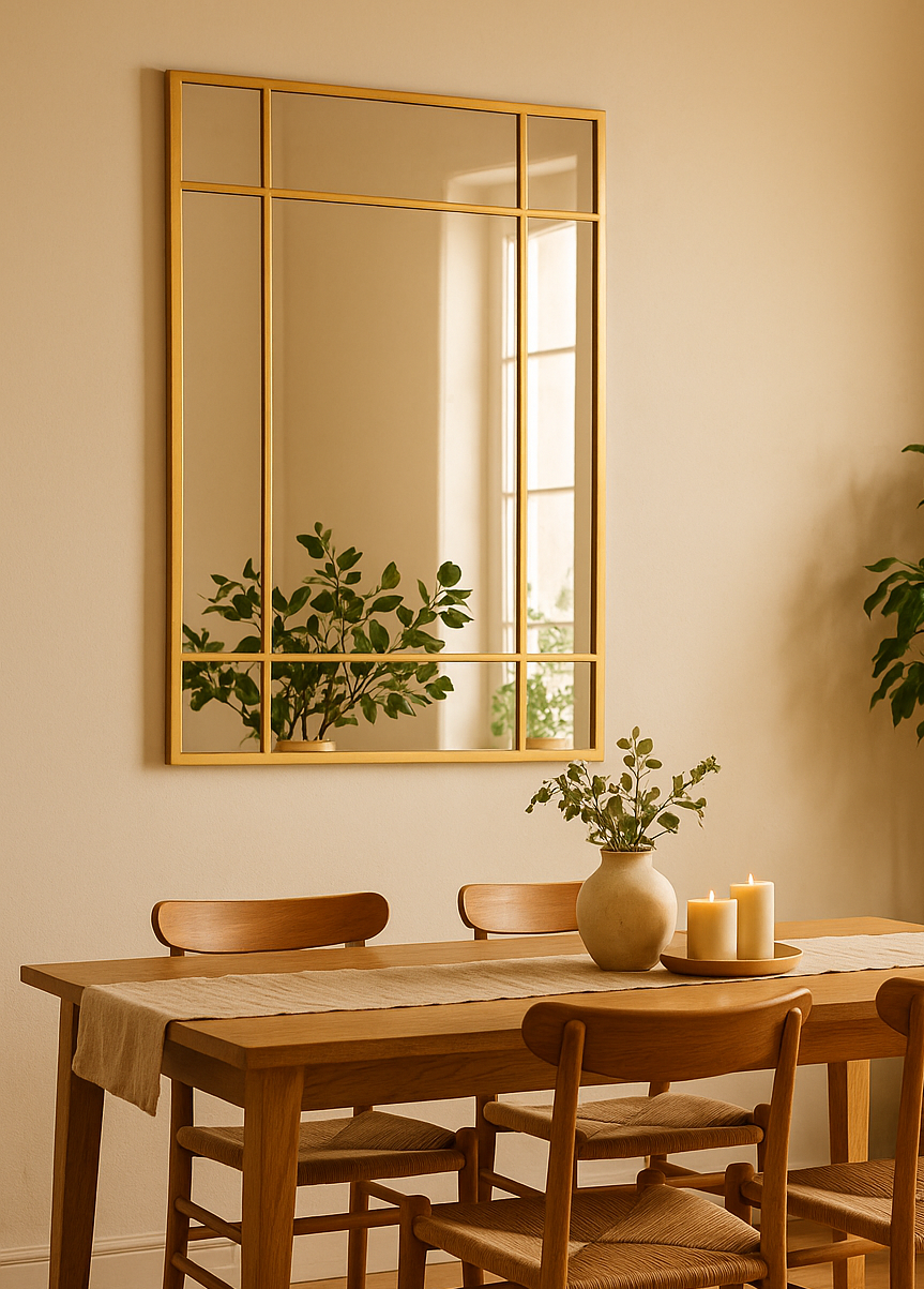 Because of its window-style layout, the Frey Mirror suits both urban lofts and elegant modern homes. It works perfectly as a statement piece above a console table, in an entryway, or as a focal point in the living room. The panelled design introduces texture and symmetry, giving your wall an architectural edge.