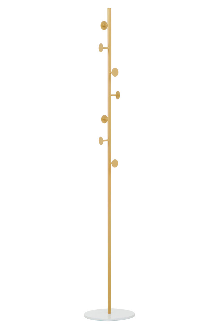 The Rome Gold & White Coat Stand features a slim gold metal frame and white marble-effect base. A modern, elegant coat rack perfect for stylish entryways.