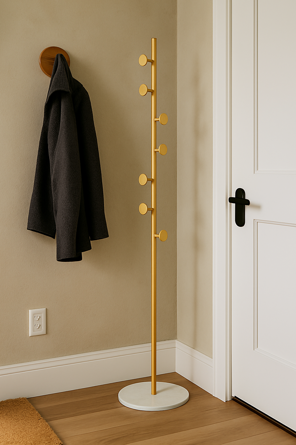 This elegant coat stand features a slim gold metal body that adds warmth and glamour to your décor. The lustrous finish catches the light beautifully, giving the piece a radiant, high-end appeal. Moreover, the minimalist form allows it to fit effortlessly into compact spaces, maintaining a clean and airy aesthetic.