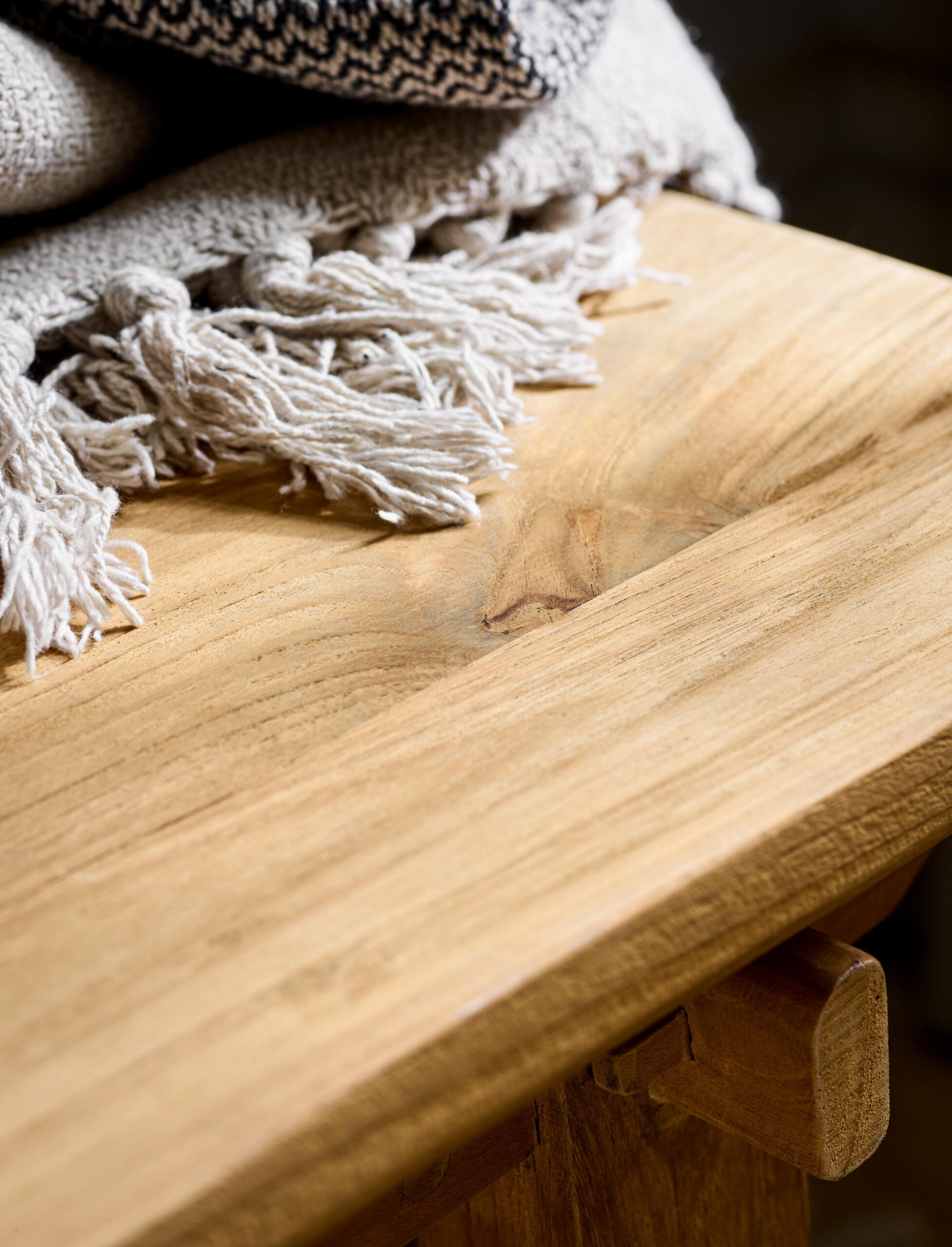 The Hanborough Bench brings rustic warmth, natural texture and handcrafted charm to any home. Made from recycled teak wood, this bench showcases the rich grain, organic markings and unique character that reclaimed timber is loved for. The classic trestle style frame feels homely and timeless, while the live edge detail along the top highlights the natural shape of the wood.