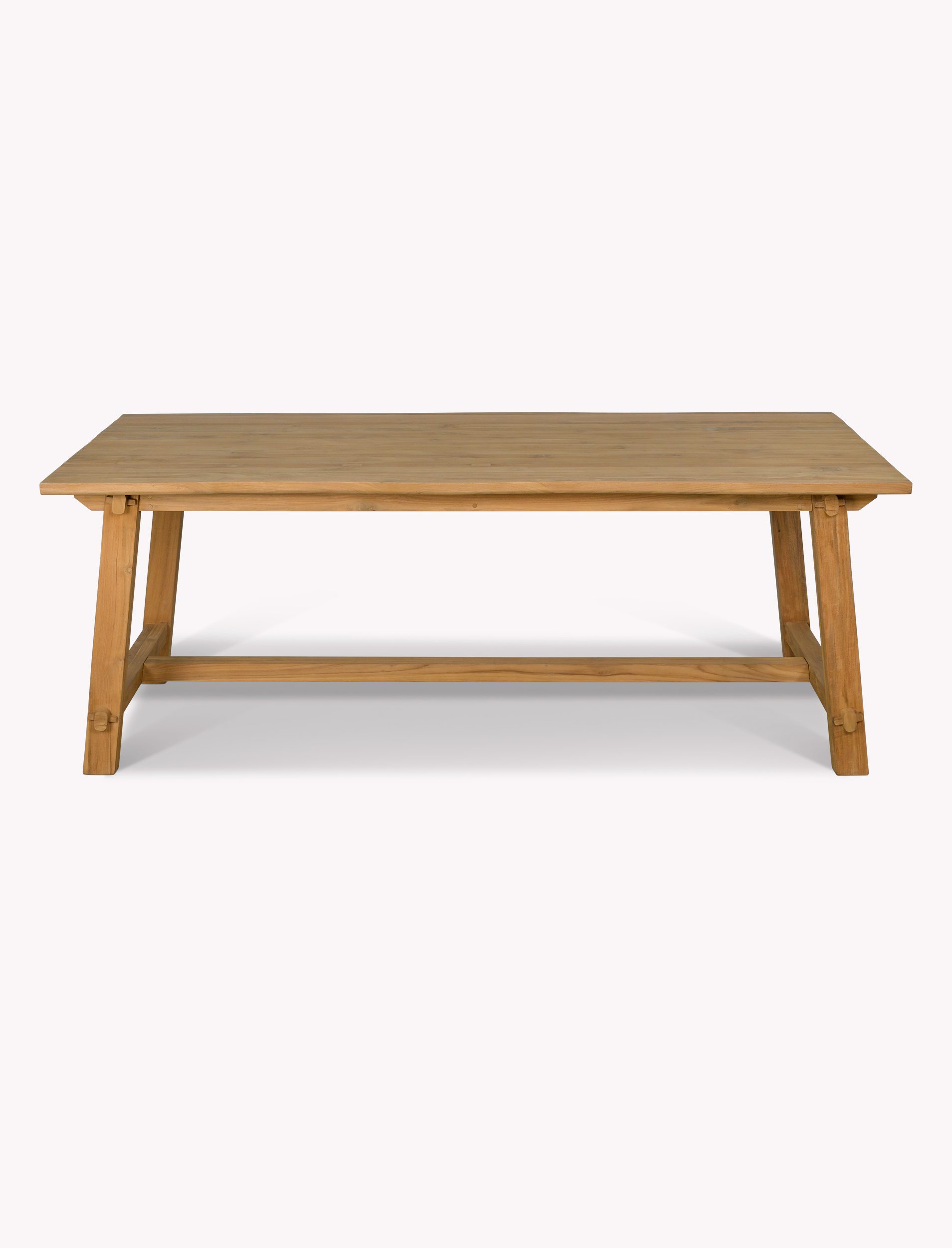 The Hanborough Dining Table brings rustic warmth, natural texture and handcrafted quality to any kitchen or dining room. Made from recycled teak wood, this table carries the character of its former life, with visible joints, rich grain and organic markings that make every piece unique. The classic trestle design gives it a homely, timeless feel that suits country cottages, townhouses and modern rustic interiors alike.