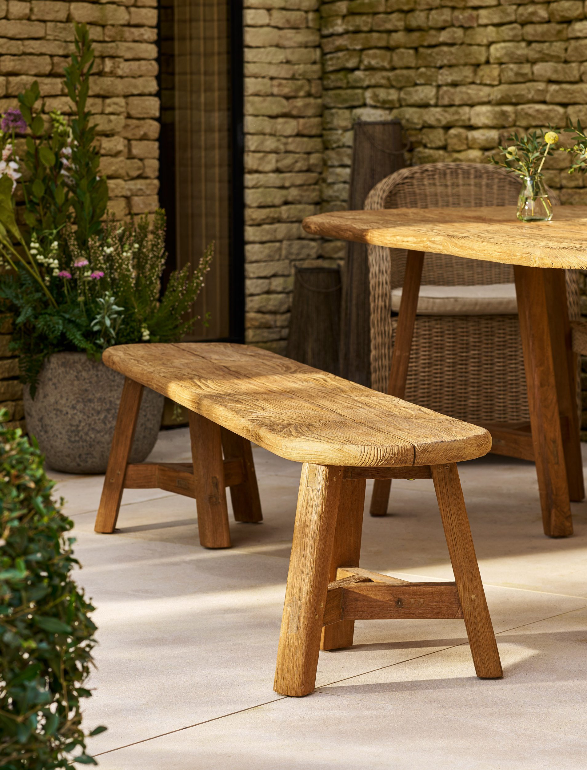 Reclaimed teak is exceptionally strong and naturally weather resistant, making this bench ideal for patios, terraces and garden dining areas. Indoors, its organic grain and soft brown tone add an earthy, grounded feel to kitchens and dining rooms. Over time, the wood gently weathers into a silvery patina, enhancing its rustic, lived in charm.