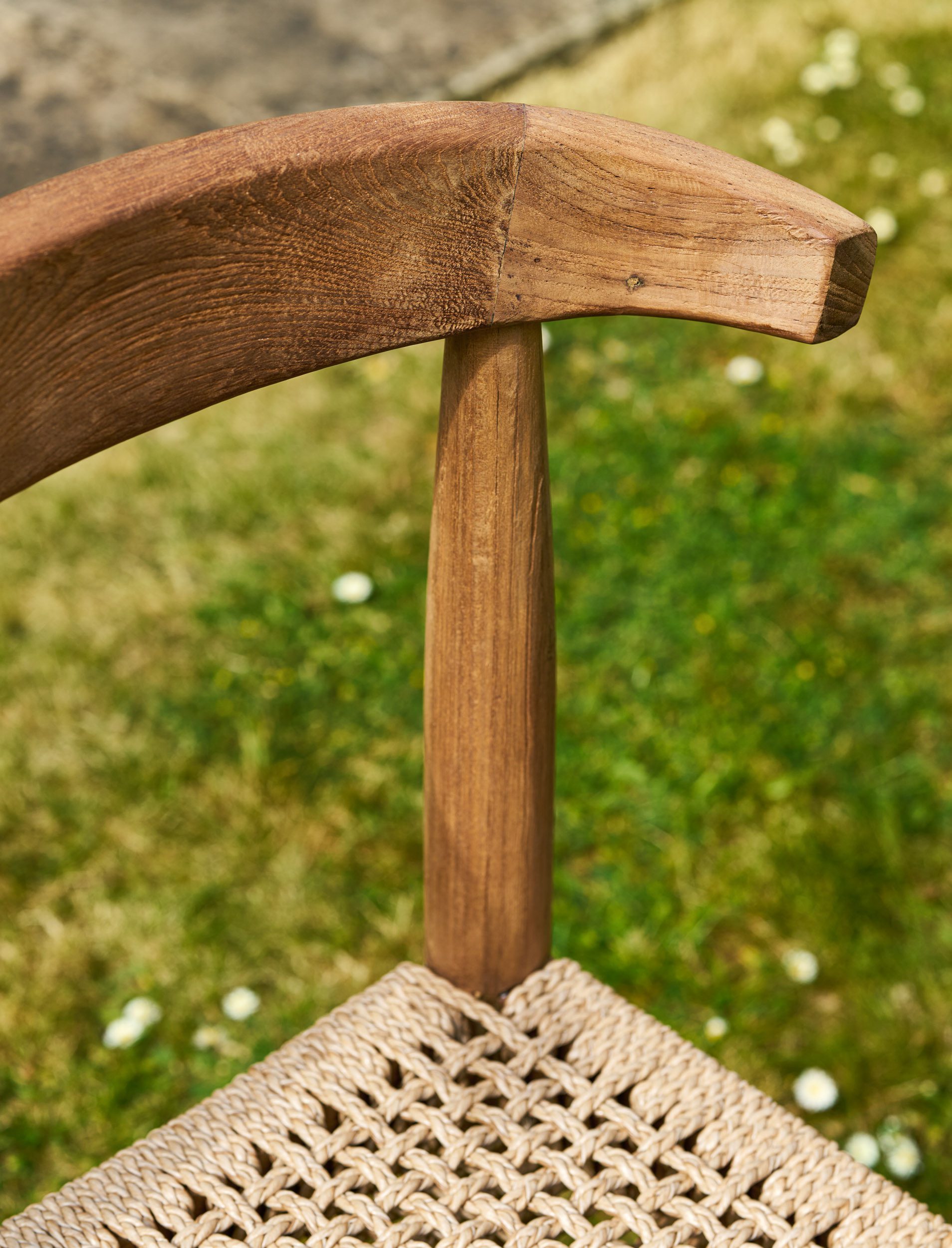 Each chair features a woven hyacinth seat that offers comfort and natural texture. The combination of teak and hyacinth creates a warm, organic look that pairs perfectly with both the Hawthorne Round Dining Table and Hawthorne Oval Dining Table. Discreet plastic feet help raise the chairs off wet ground and protect the legs outdoors.