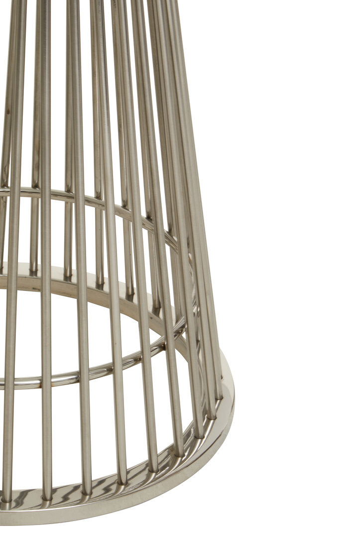 Beneath the glass, the silver stainless steel base features a geometric, art deco–inspired form. The intersecting lines and polished finish create a visual rhythm that adds sophistication to the piece. This strong and durable metal structure ensures lasting stability while maintaining a refined, luxurious appearance.