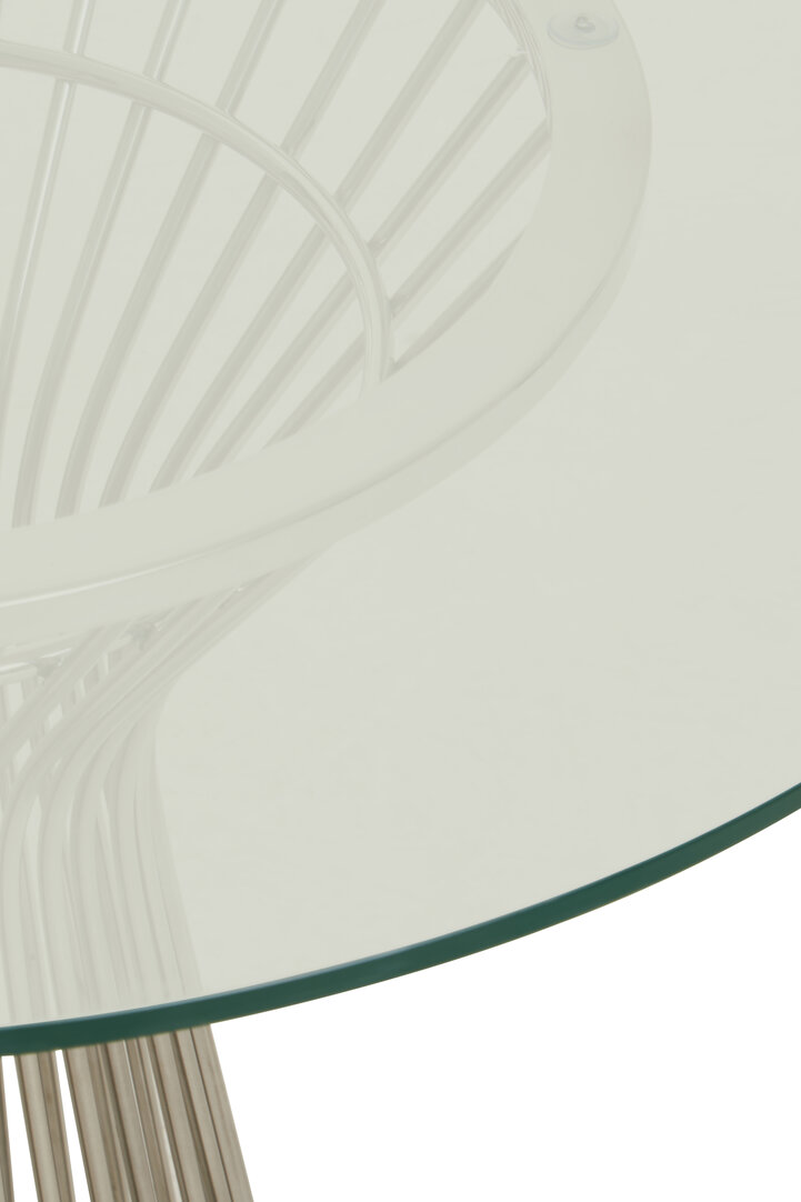 The Kaya Glass Dining Table features a round glass top & silver stainless steel base. Art deco-inspired, sleek & durable. Ideal for modern luxury interiors.