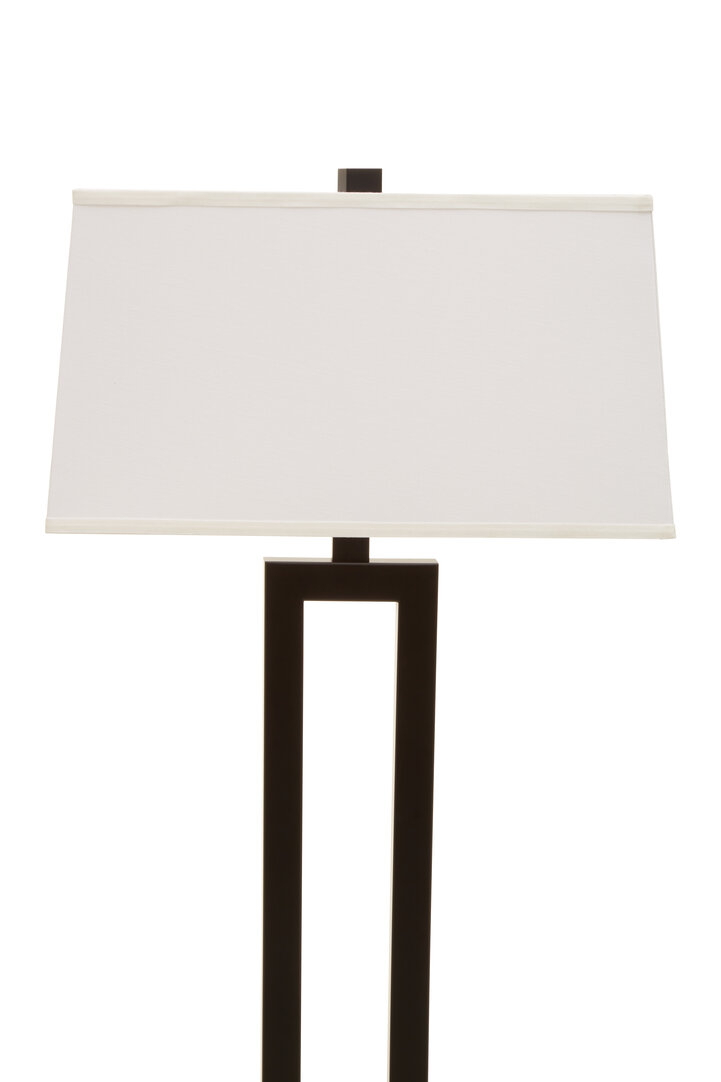 Above the base sits a slightly tapered white fabric shade that completes the monochromatic palette. The crisp white tone contrasts beautifully with the dark metal frame, creating a harmonious blend of light and shadow. When illuminated, the shade emits a soft, ambient glow that enhances the warmth and character of any room.