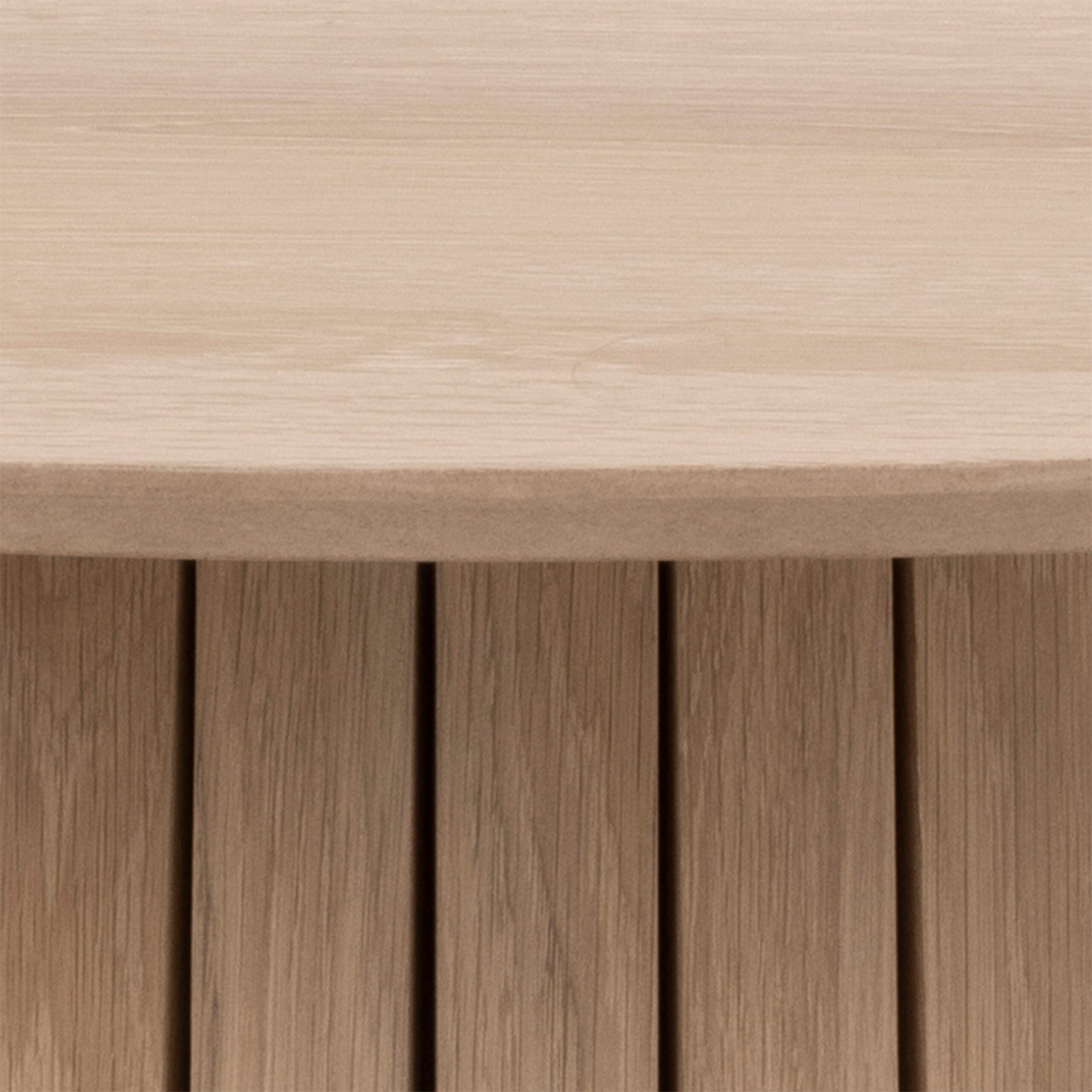 The smooth round tabletop features a subtle white pigmented oak finish that gently lightens the wood while still showcasing its natural grain. As a result, it adds brightness and softness to the room without feeling stark. This makes it perfect for Nordic inspired, minimalist, or contemporary homes.