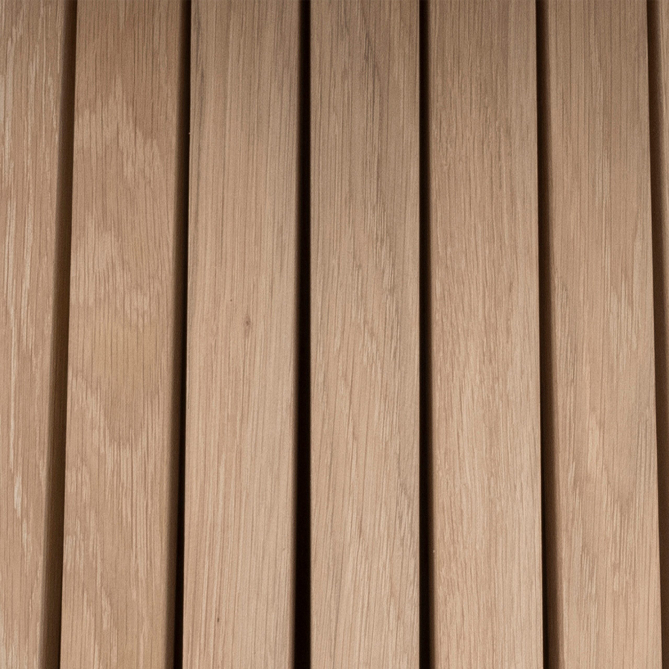 Beneath the top, the conical panelled base with lamella slats creates a sculptural focal point. The vertical slats add texture and rhythm, giving the table an architectural feel while keeping the look light and modern. At the same time, the centred base provides excellent stability and plenty of legroom for everyone seated around it.