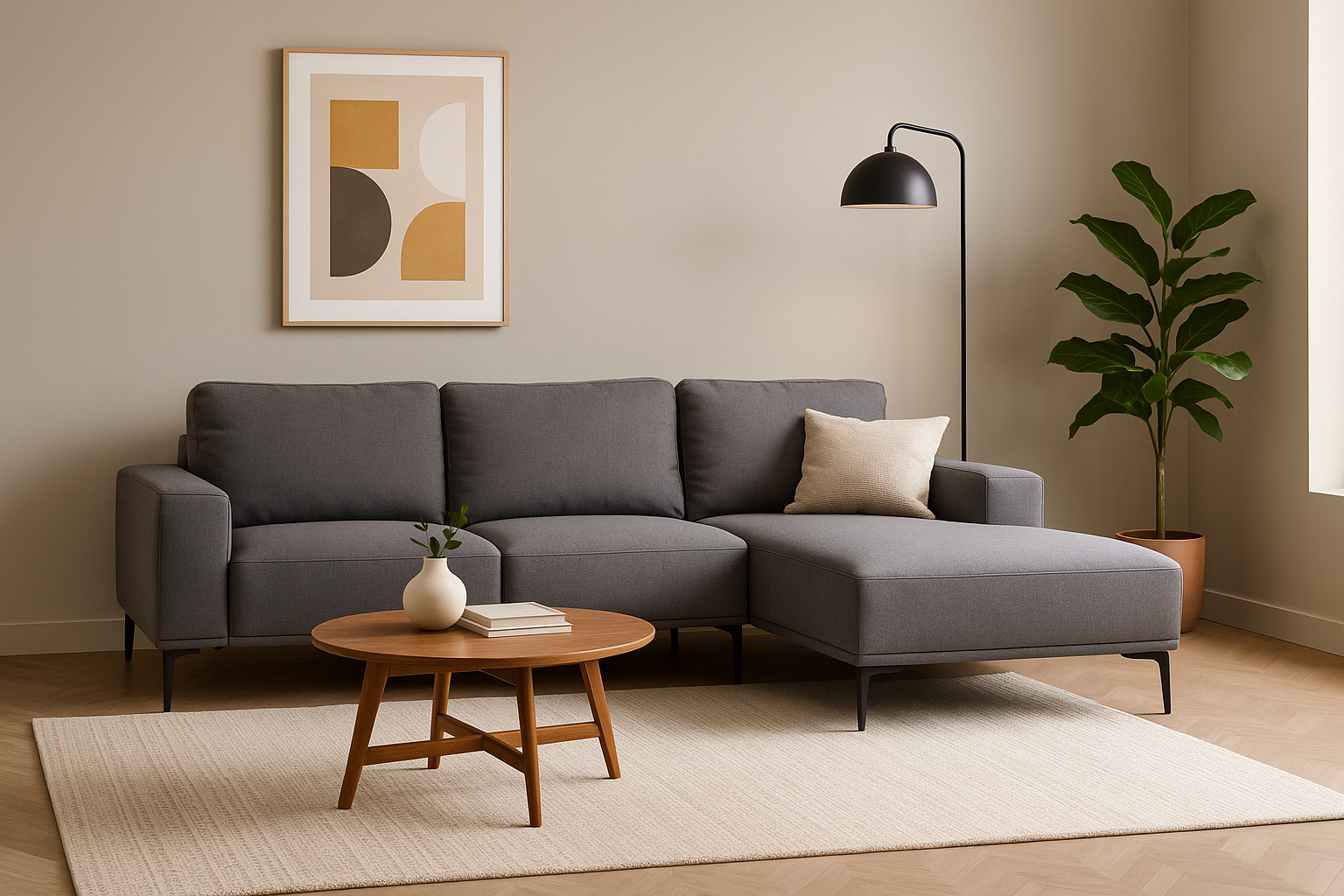 The Manor 3 Seater Right Chaise Sofa features natural or grey fabric upholstery, plush cushioning & sleek black legs. Modern, elegant & comfortable.