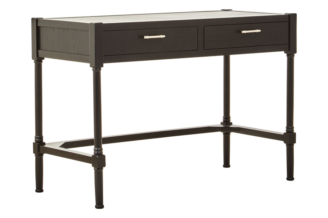 The Marin 2 Drawer Pine Desk features a black pine wood frame, carved legs, and silver handles. A modern yet classic desk for elegant home offices.