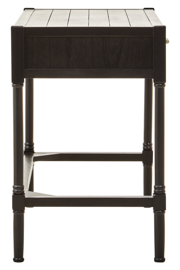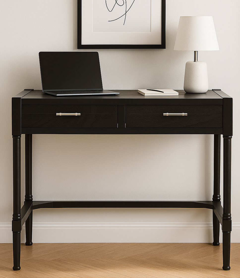 The Marin 2 Drawer Pine Desk suits various interior themes, from modern farmhouse to transitional and vintage-inspired settings. Its combination of black wood tones, silver accents, and sculpted form adds character without overpowering your décor.