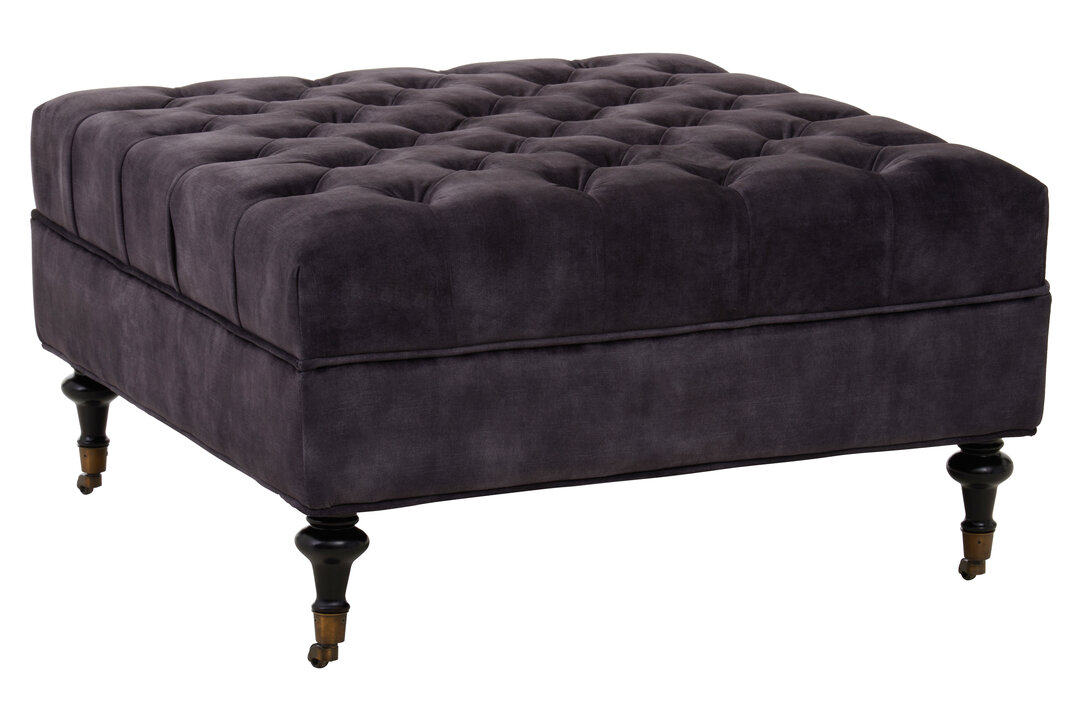 Naya Velvet Ottoman in dark grey velvet with button tufting, plush padding & castor wheels. A luxurious & versatile accent piece for any interior.