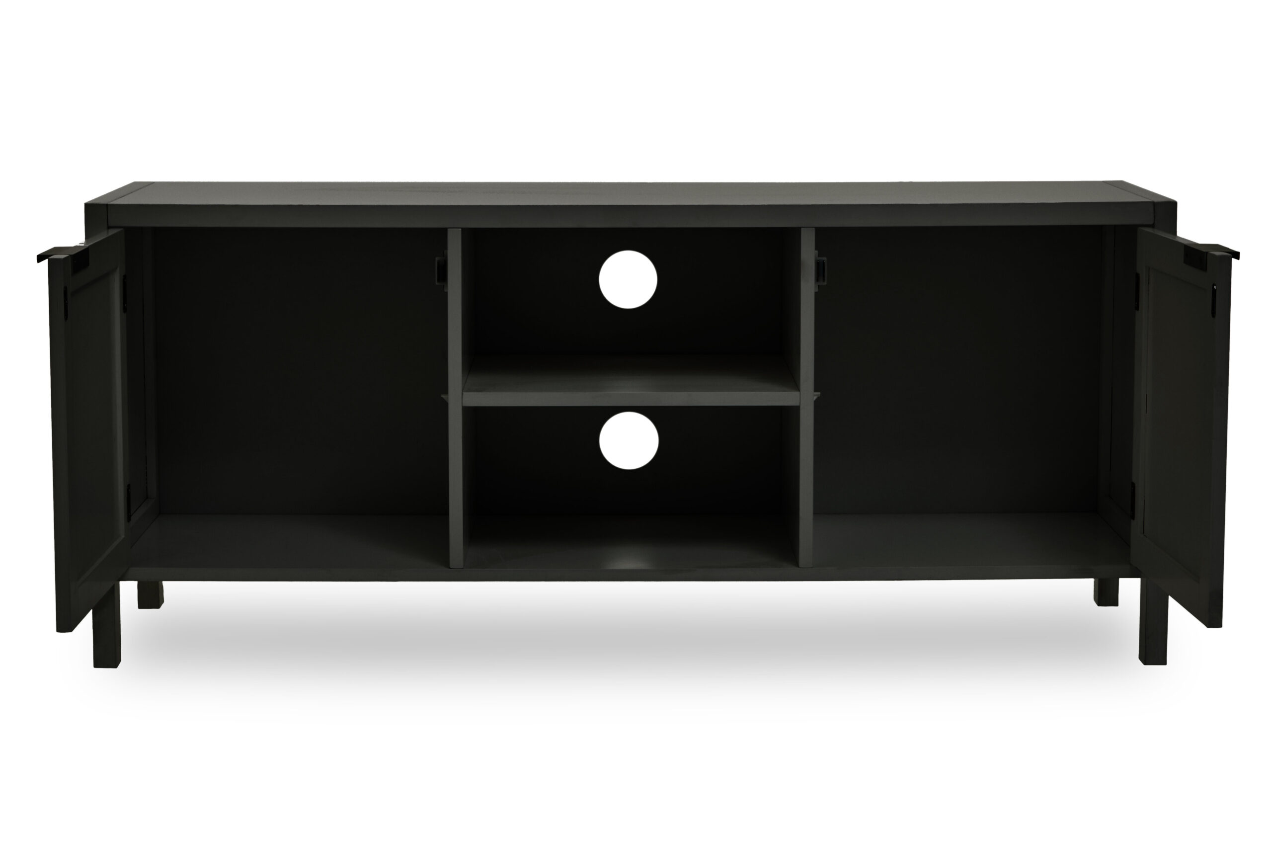 The unit is built to last, with a sturdy wood construction that ensures durability. The smooth black finish is not only visually appealing but also easy to maintain. You won’t have to worry about wear and tear over time. The Nero Media Unit is designed to hold a television and media equipment securely, making it a reliable storage solution for your entertainment needs.
