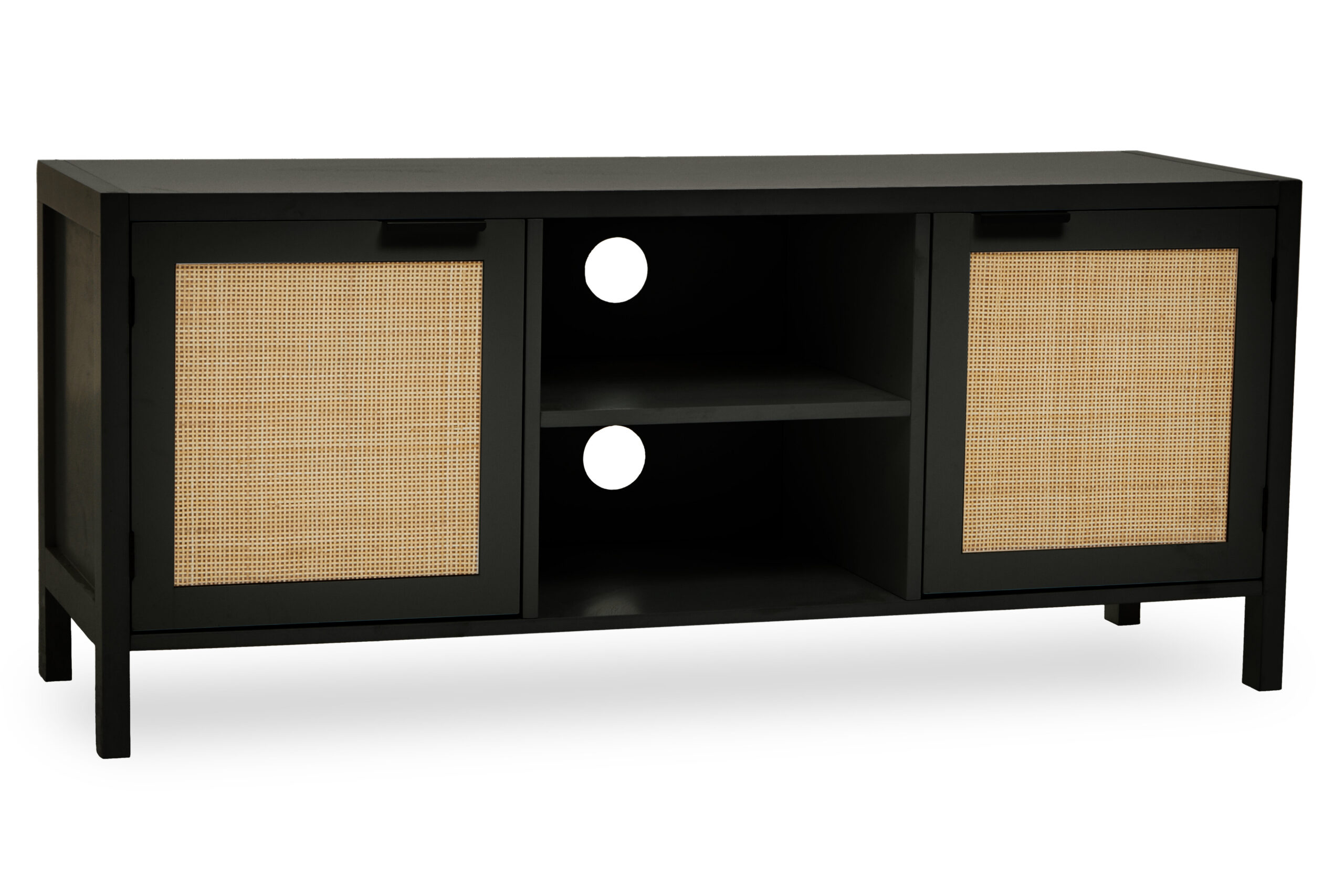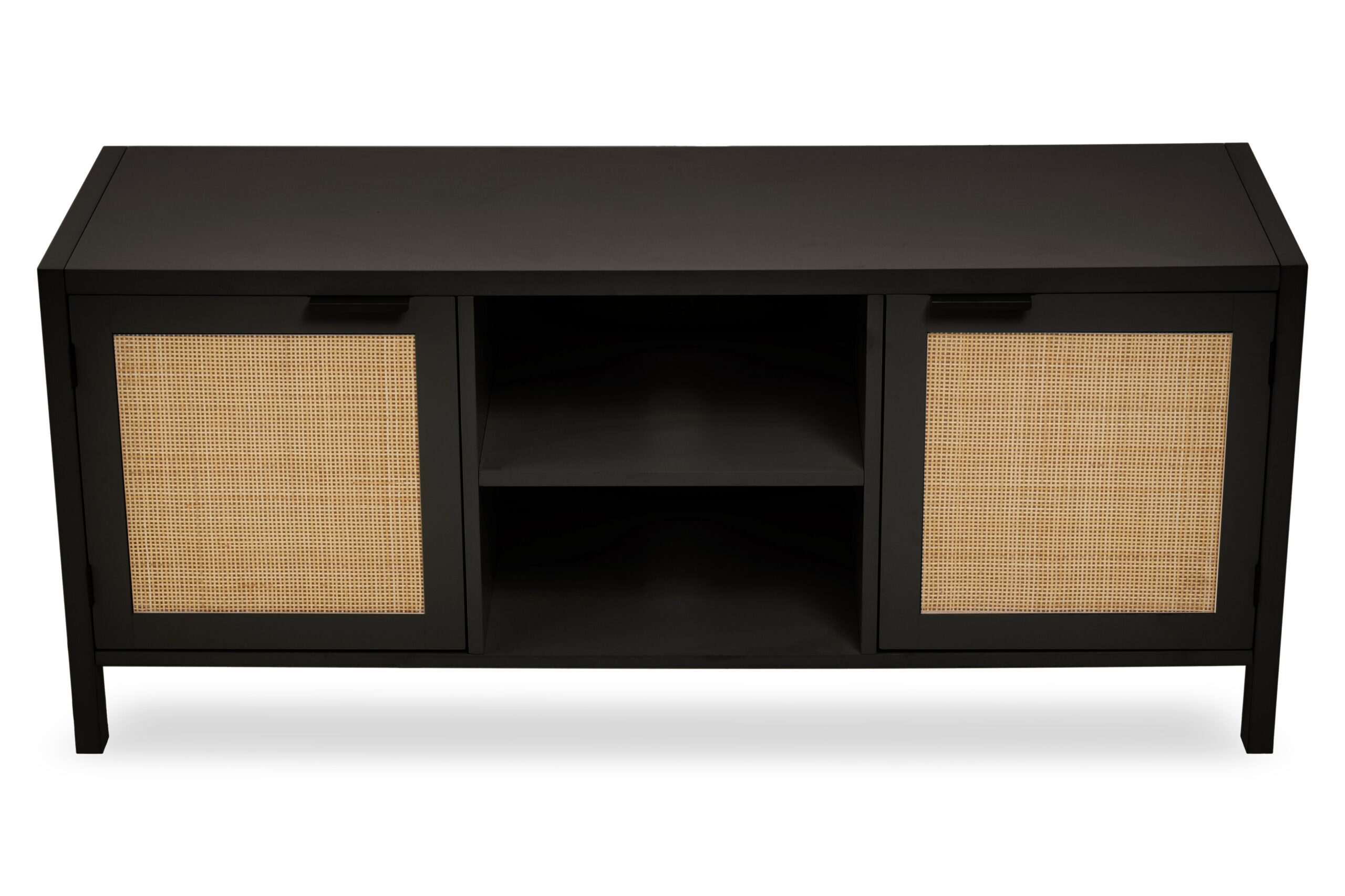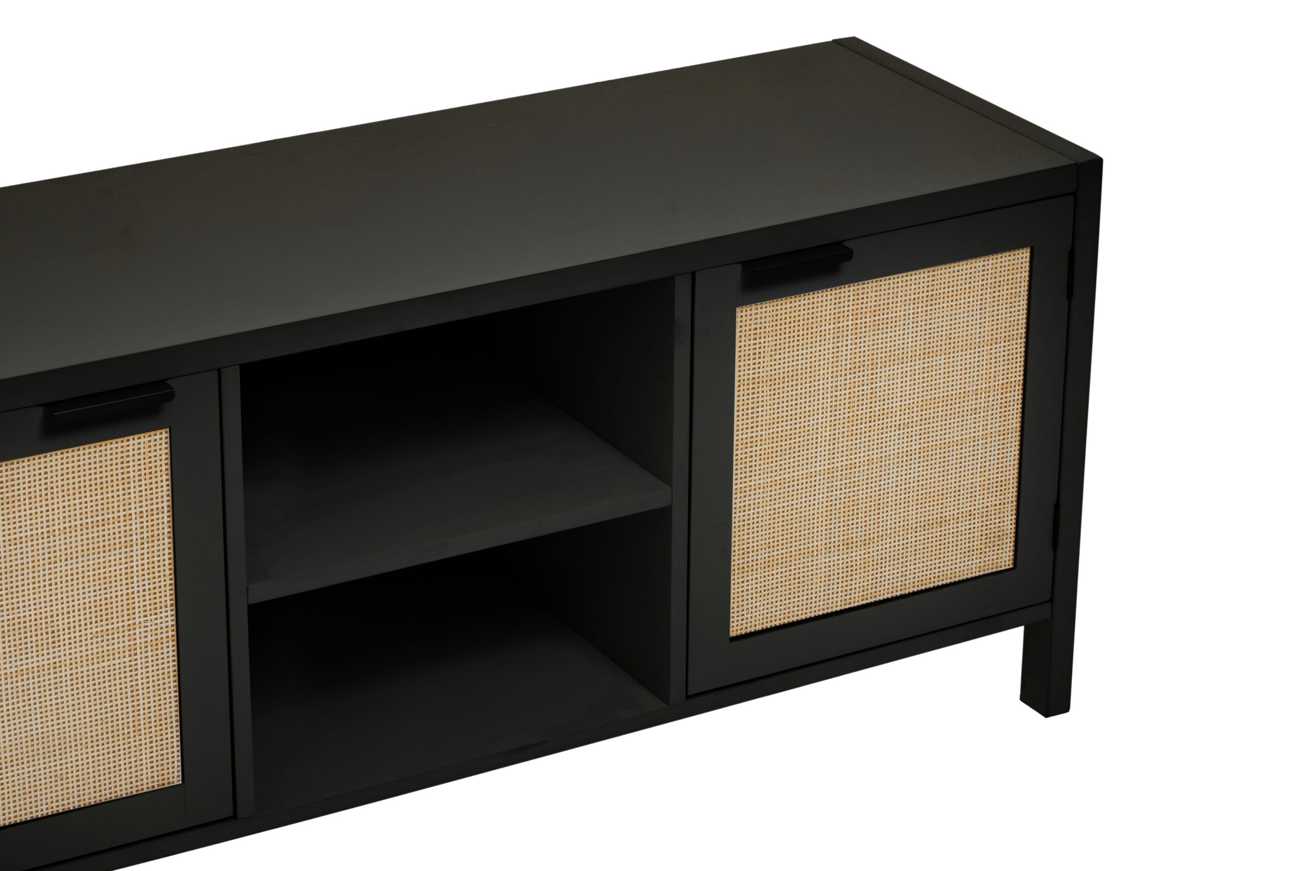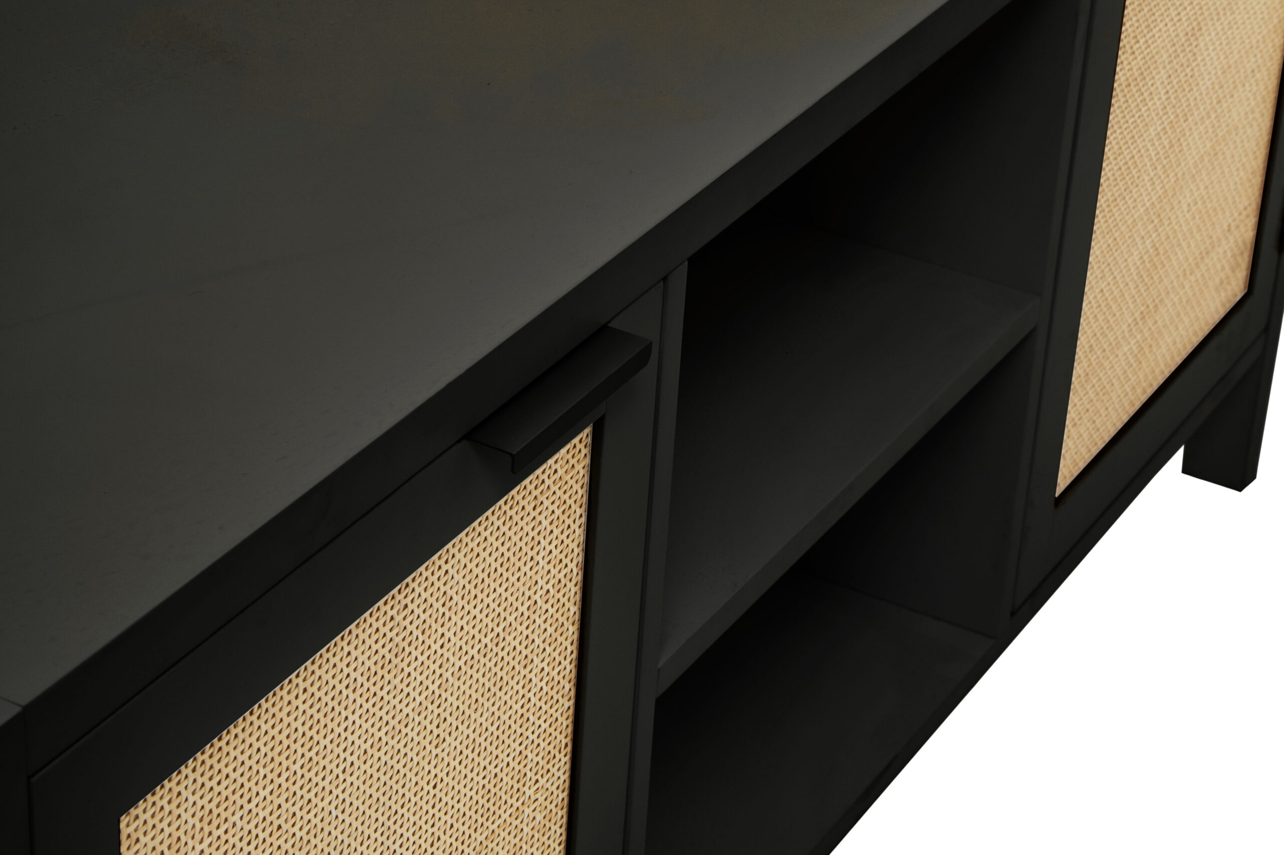 It offers two open shelves for your media devices, such as gaming consoles, cable boxes, and DVD players. These open compartments provide easy access to your electronics while keeping everything organised. It also includes two closed storage spaces. The rattan panel doors create a warm, natural touch, contrasting beautifully with the sleek black finish. These closed shelves are perfect for stashing remotes, books, and other accessories.