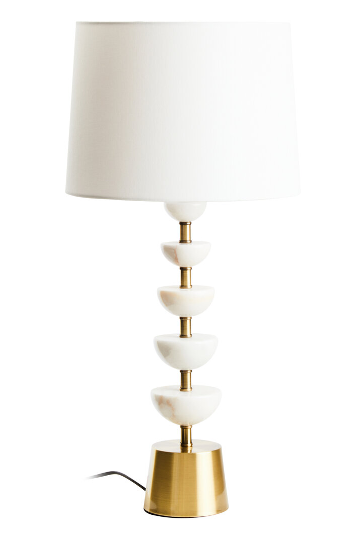The Orla Table Lamp merges contemporary design with luxurious materials, creating a statement piece for any interior. Its sleek gold metal frame is stacked with half-cut white marble orbs. Giving the lamp a sculptural, modular look. This unique combination of metallic and natural stone adds texture, depth, and sophistication to your living room, bedroom, or office space.