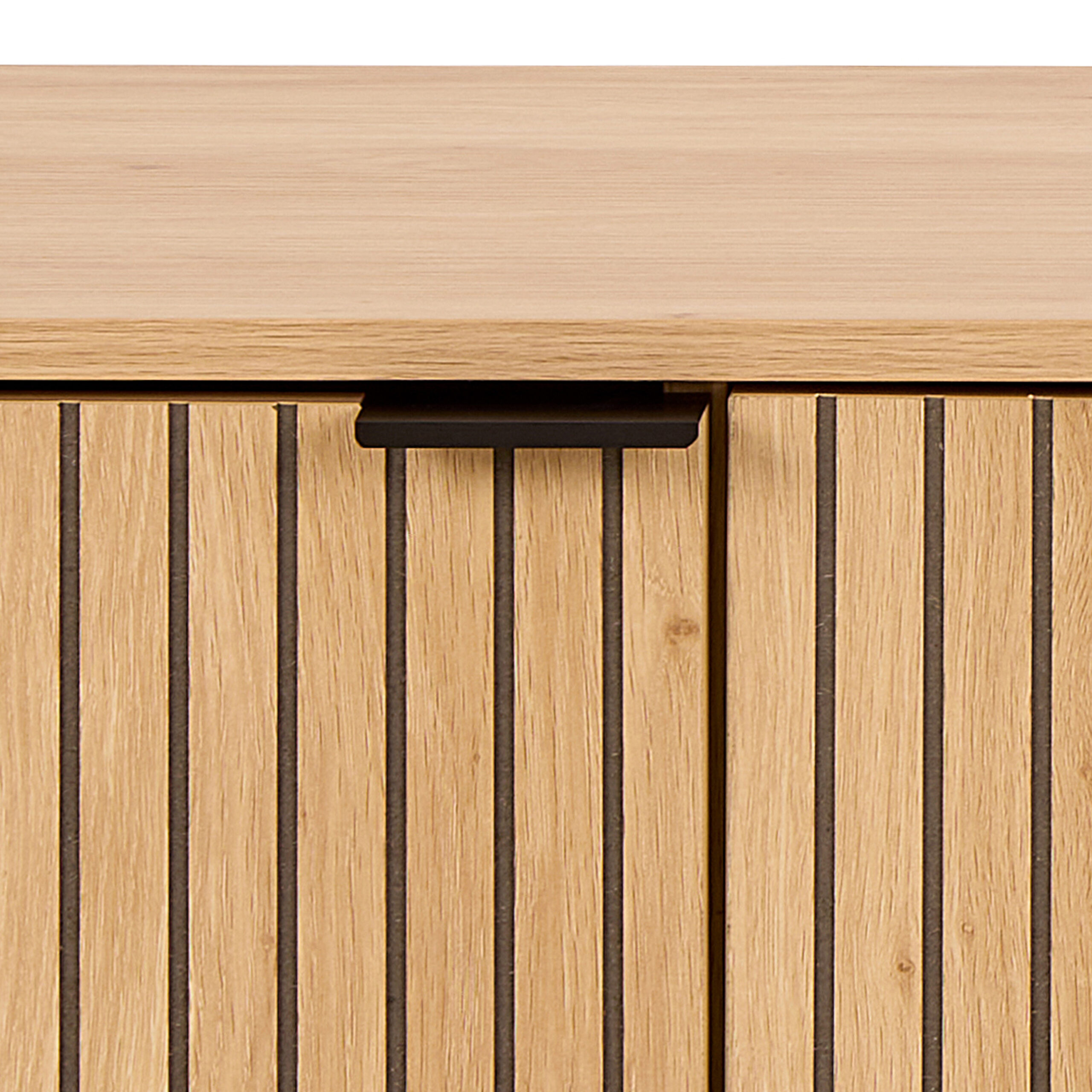 The Purino Media Unit features a slatted oak-effect design with black legs, offering modern style & spacious hidden storage for any living room.