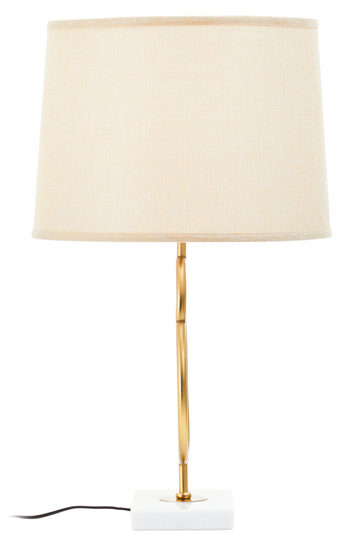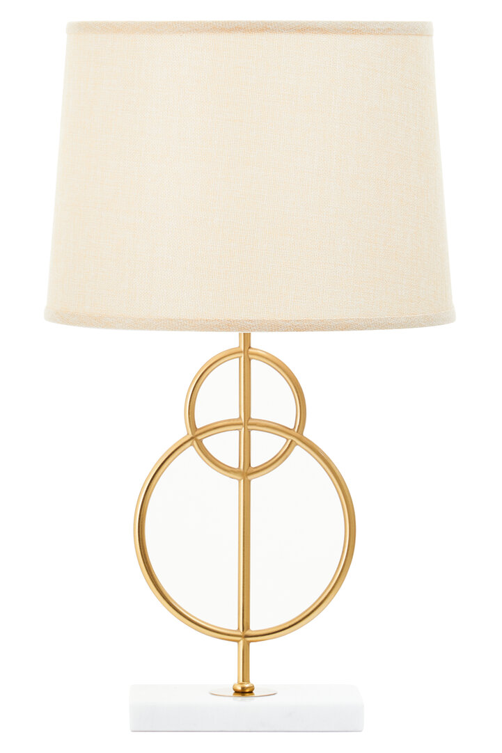 The Raya Gold Circles Table Lamp features a looped gold metal stem, white marble base, and beige linen shade for an elegant art deco look.