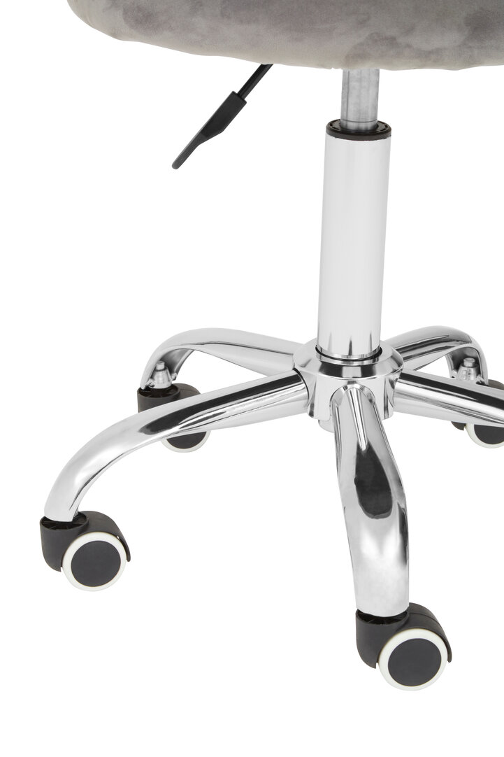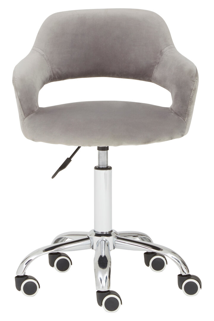The Renin Desk Chair with Curved Back combines grey velvet upholstery, a chrome swivel base & ergonomic comfort. Modern, adjustable & ideal for home offices