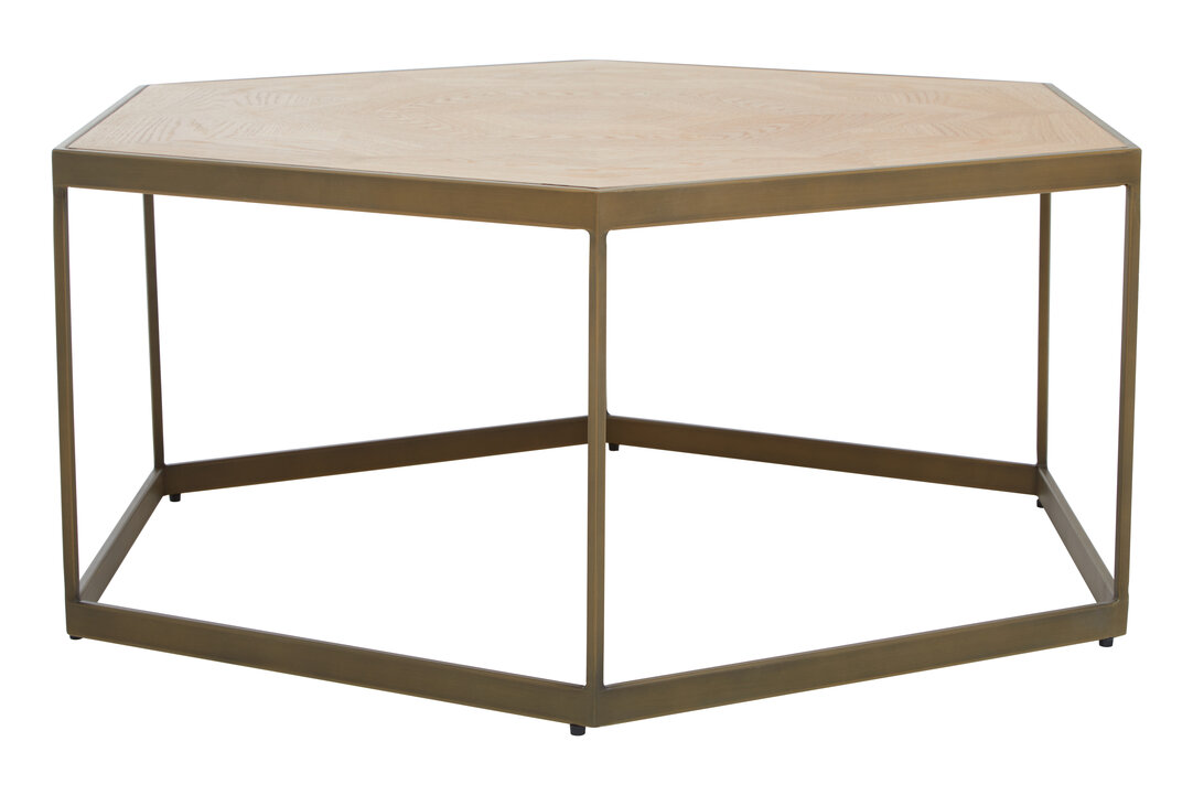 The Sana Hexagonal Coffee Table features an oak veneer top & brushed brass steel frame. A modern, minimalist piece that blends warmth with design.