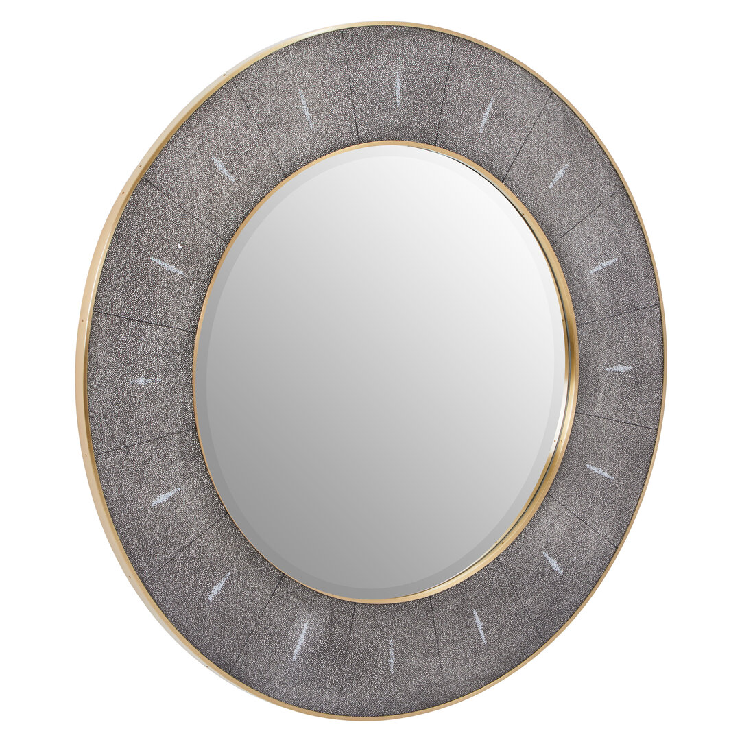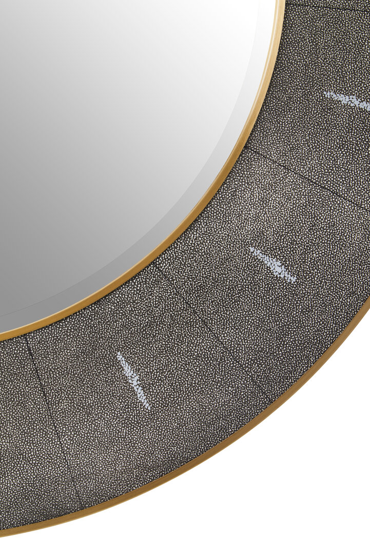 Expertly crafted with a textured grey shagreen frame, this mirror offers a sophisticated finish that mimics natural stingray leather. The soft texture adds depth, while the muted grey tone compliments both warm and cool palettes. To elevate its appearance, gold-finished trims outline the interior and exterior edges, bringing a touch of glamour and light to your space.