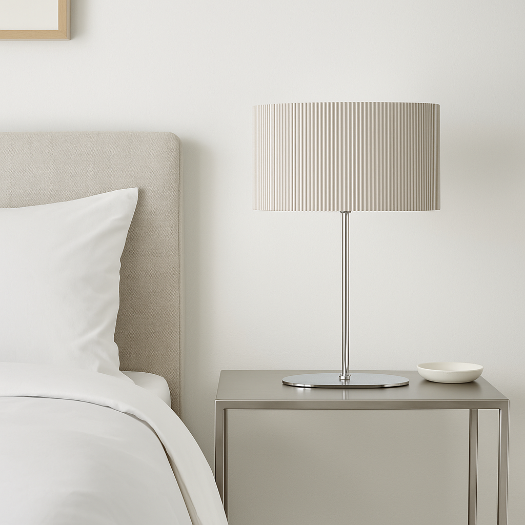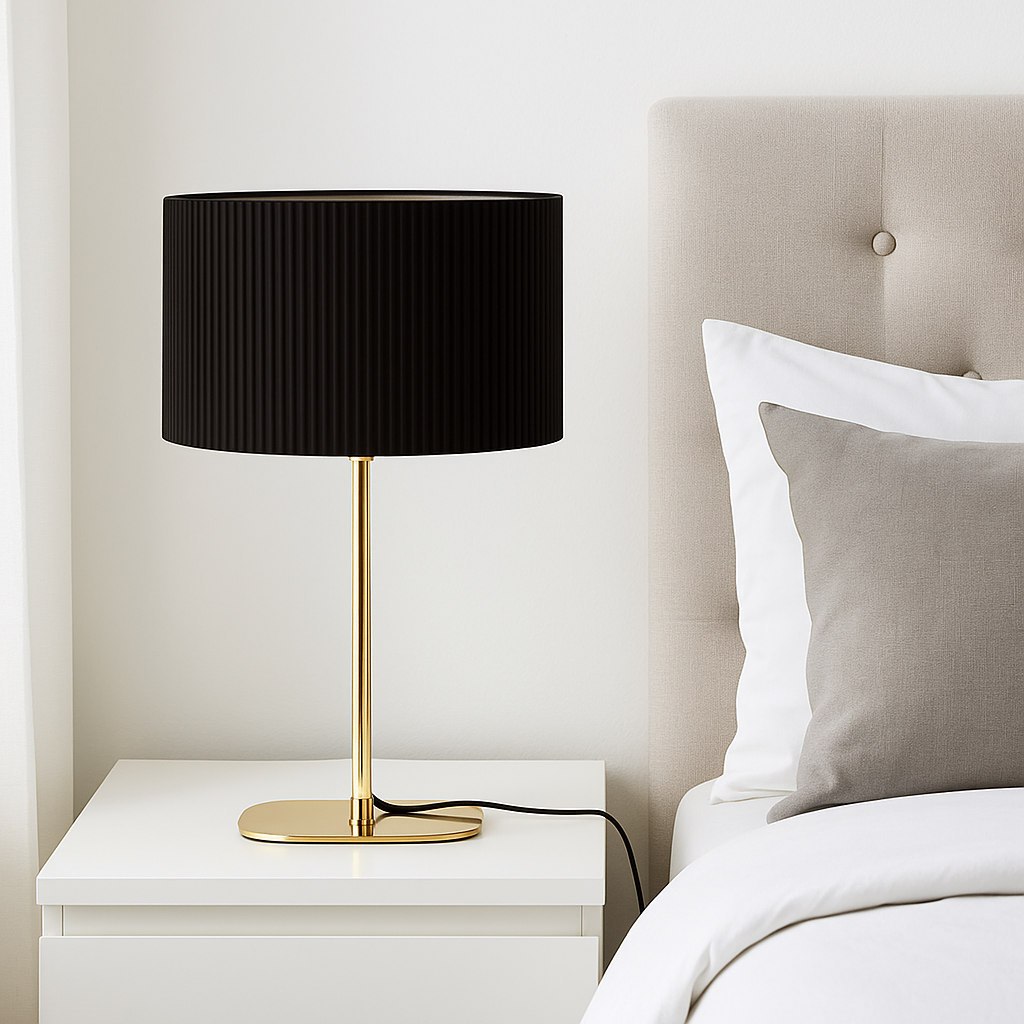 The Forma Lamp offers not only style but also functionality. The ribbed fabric shade diffuses light evenly, creating a soft glow suitable for reading, relaxing, or entertaining. Its compact structure allows easy placement on side tables, consoles, or bedside stands.