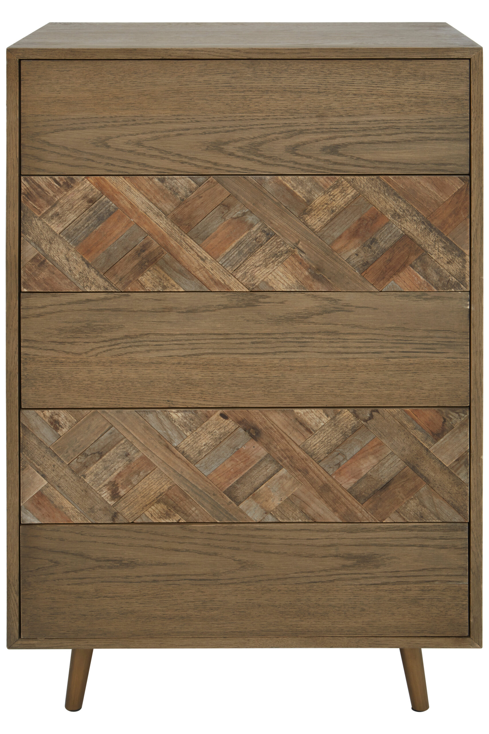 The Silas 5 Drawer Chest blends natural oak and elm wood with brass feet and subtle geometric detail for stylish, functional bedroom or living room storage.