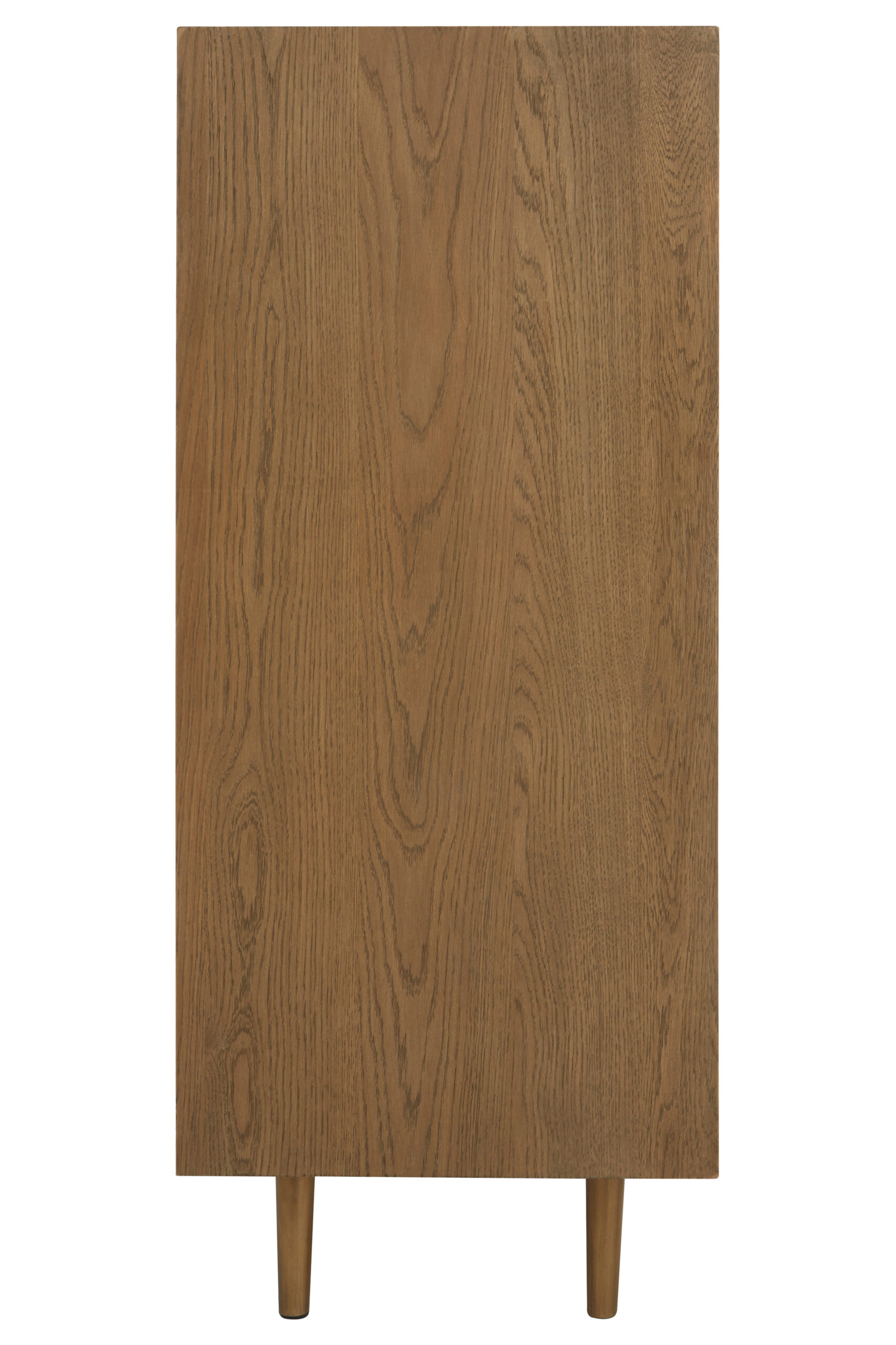 The Silas 5 Drawer Chest is a sophisticated blend of form and function. Crafted from a combination of oak and elm wood, this chest boasts natural tones that bring warmth and character to any room. The rich grain pattern on the drawer fronts highlights the natural beauty of the wood, adding depth and texture to the piece.