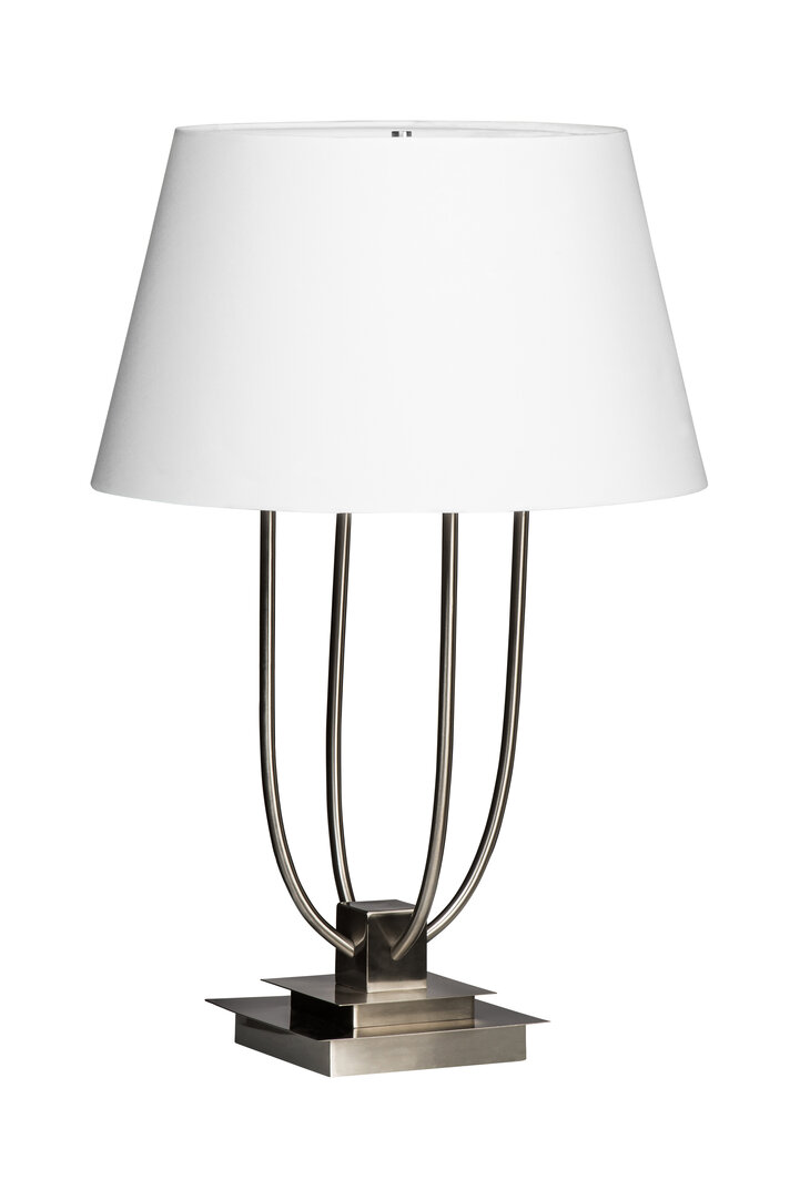 This modern table lamp features a smooth metal base with a refined satin nickel finish. The base offers a subtle sheen that enhances its clean, sculptural aesthetic. Rising from it are four slender, curved arms that extend gracefully upward, adding movement and dimension to the design. The contrast between the square base and the fluid arcs creates a visually striking balance.