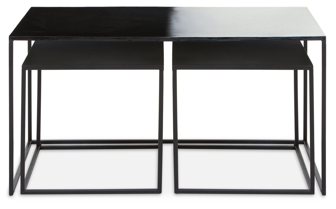Soraya Ombre Coffee Table Set, 3-piece nesting tables in black and white metal. Minimalist, durable, and versatile for modern and contemporary living spaces.