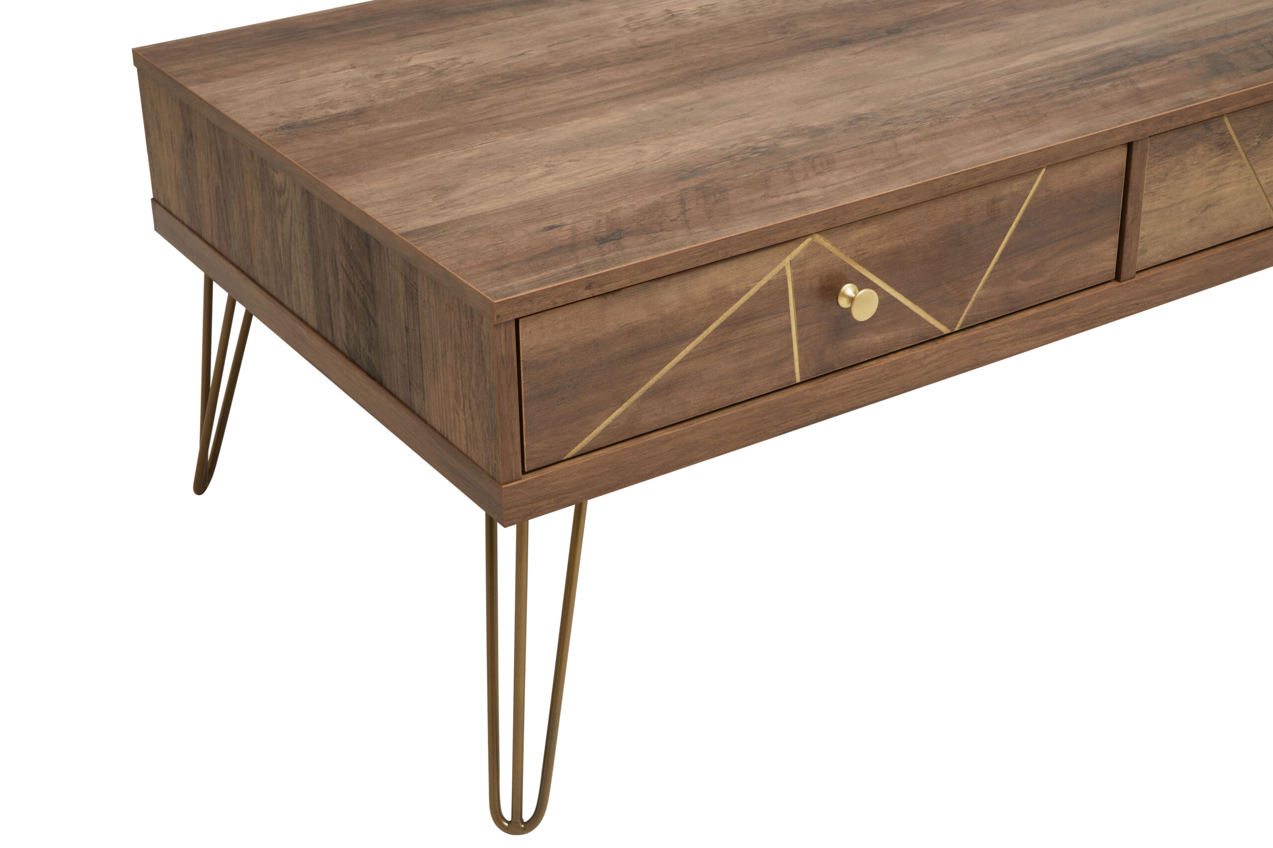 Elevate your living room with the Talia Coffee Table in rustic wood tones. Mid-century design, two drawers, and hairpin legs for chic, practical style.
