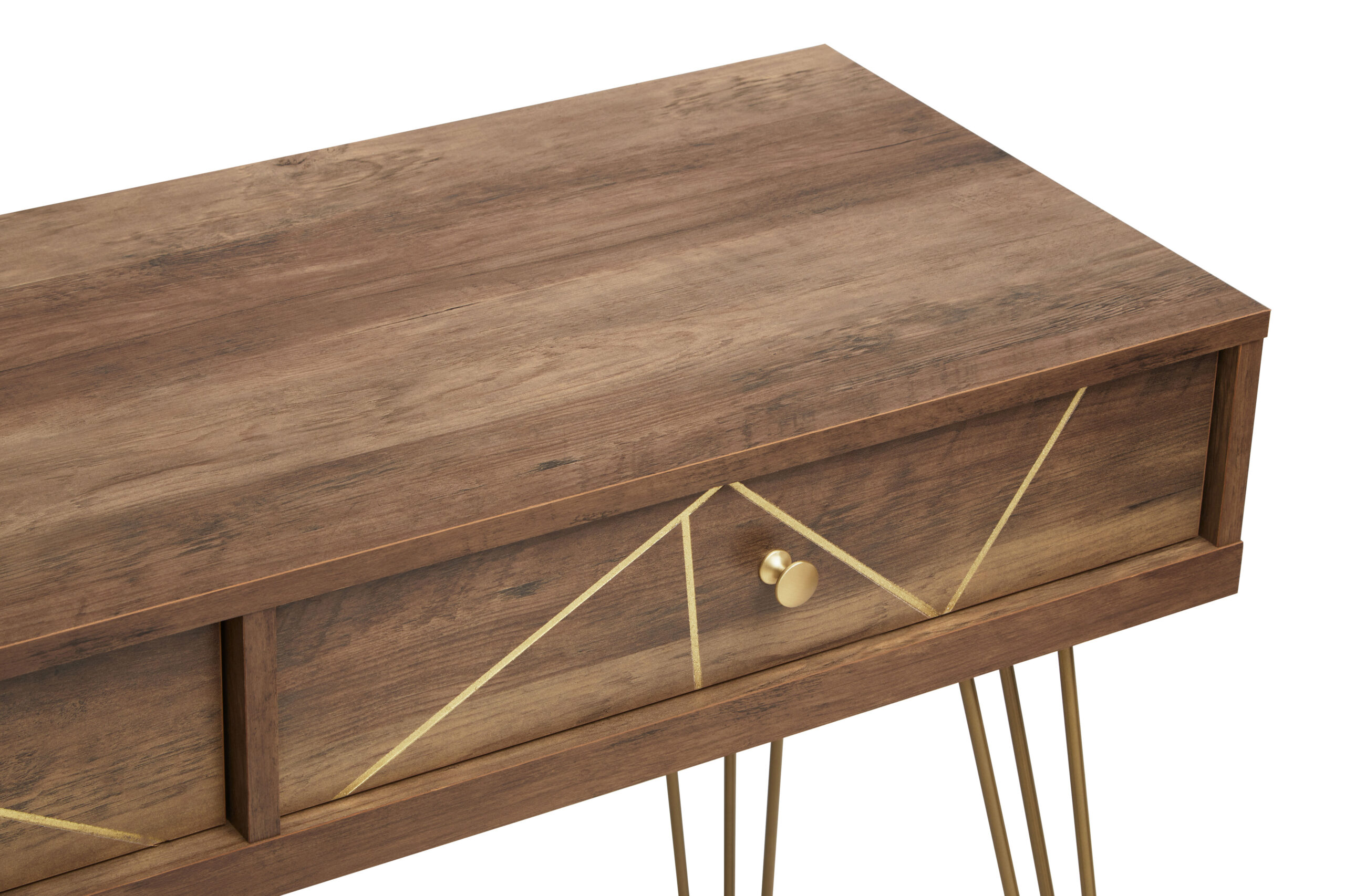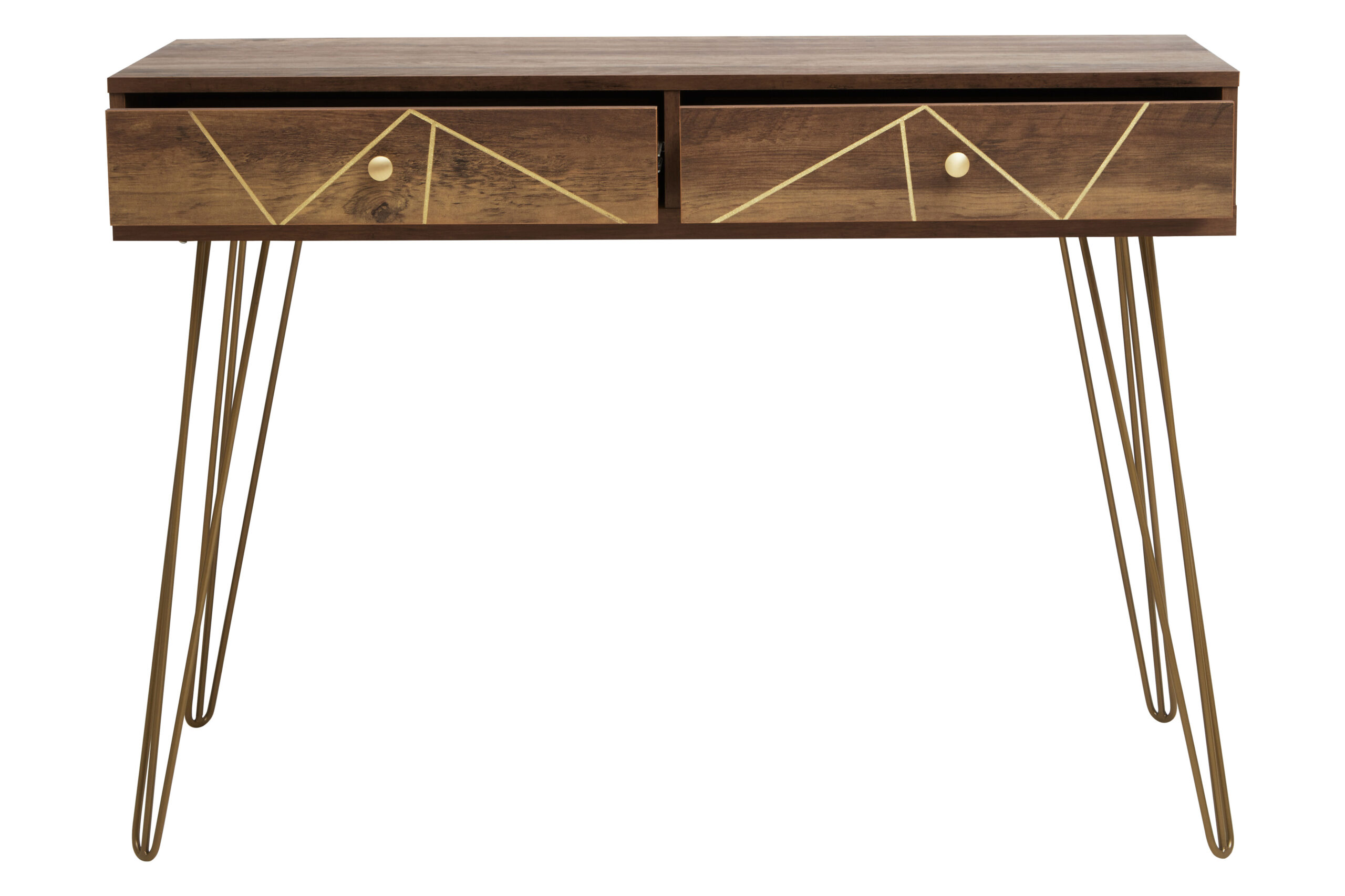 Elevate your hallway or living space with the Talia Console Table in warm wood tones. Features two drawers, metallic hairpin legs & mid-century style flair.