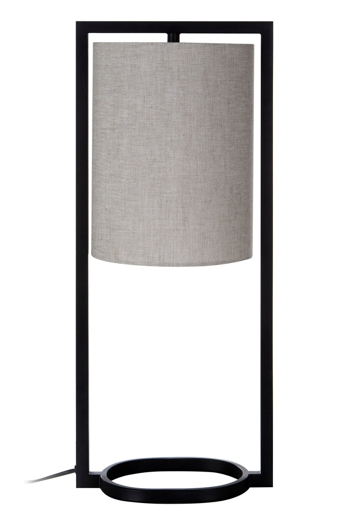 The Varn Metal Frame Table Lamp features a grey fabric shade and sleek black frame, creating a warm, modern glow perfect for side tables or desks.
