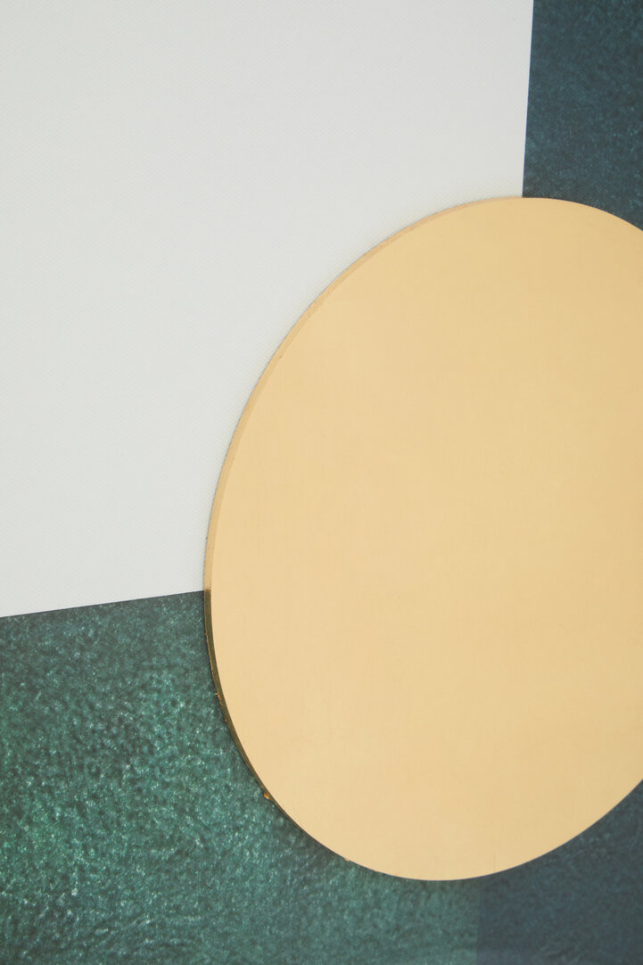 The canvas features a deep green geometric pattern contrasted beautifully against soft neutral tones. Hints of gold accentuate the shapes, giving the artwork a warm and refined glow. The mix of rich colour and metallic detail adds depth and dimension, making the piece ideal for both contemporary and classic interiors.