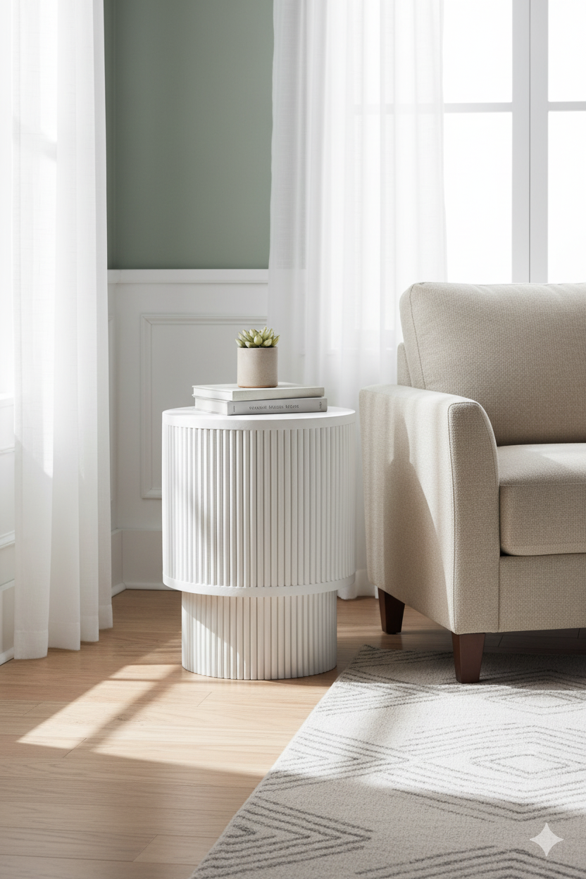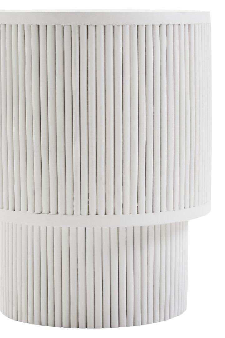Handcrafted Tova Side Table in whitewashed eco-friendly mango wood with ridge detailing. Perfect accent for living rooms, bedrooms, or reading nooks.